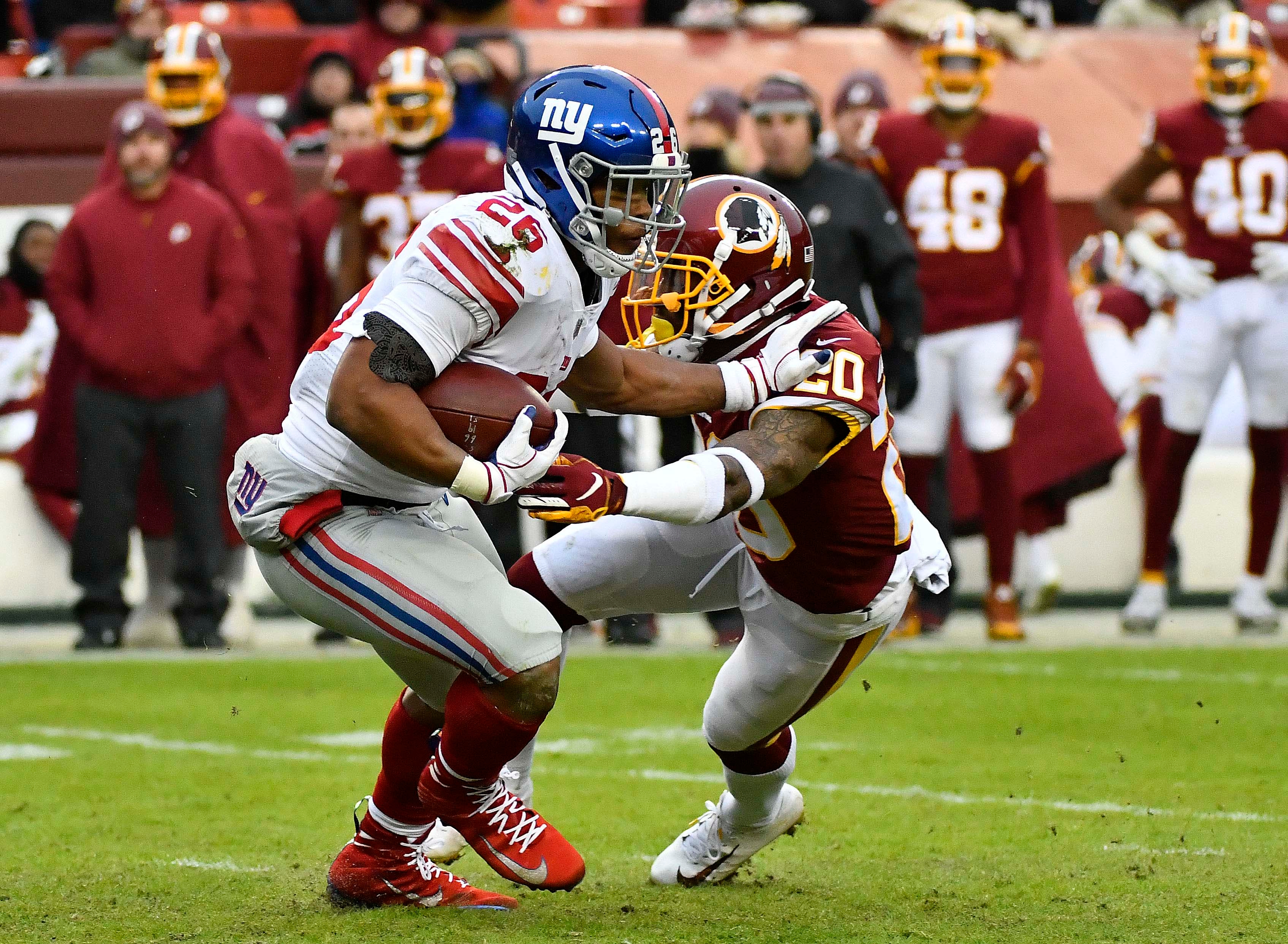 Dec 9, 2018; Landover, MD, USA; New York Giants running back Saquon Barkley (26) is tackled by Washington Redskins safety Ha Ha Clinton-Dix (20) during the second half at FedEx Field. Mandatory Credit: Brad Mills-USA TODAY Sports / Brad Mills