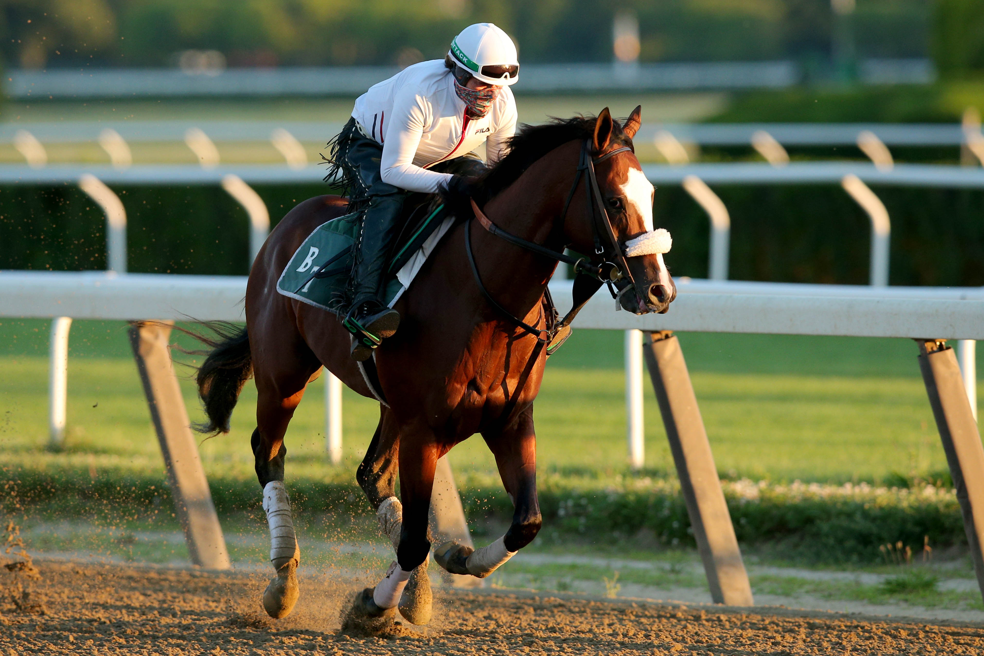 Jun 17, 2020; Elmont, New York, USA; Belmont Stakes favorite Tiz the Law runs on the main track during a morning workout at Belmont Park. Mandatory Credit: Brad Penner-USA TODAY Sports / Brad Penner