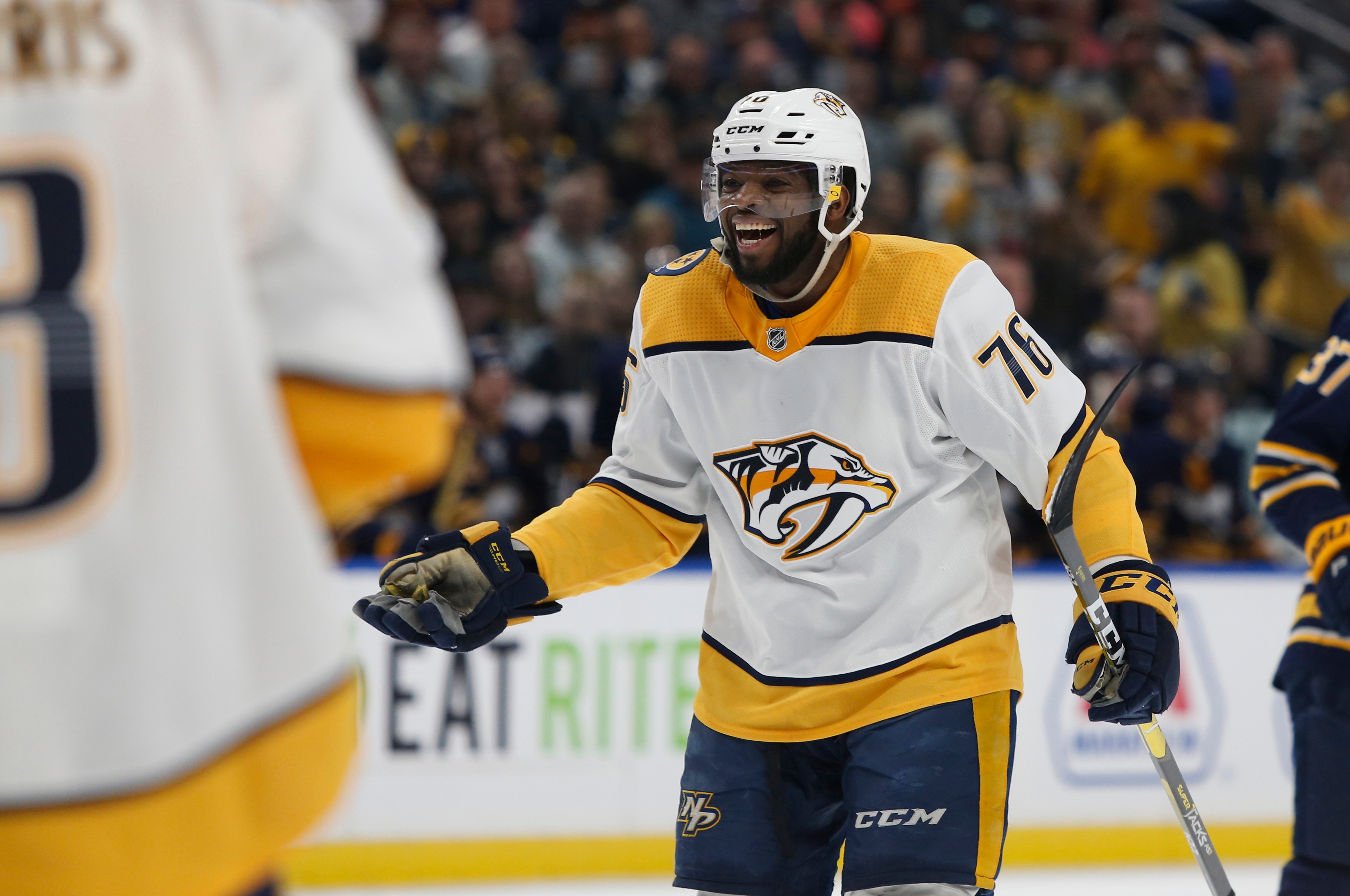 Nashville Predators defenseman P.K. Subban celebrates after a Predators goal against the Buffalo Sabres during the first period at KeyBank Center. / Timothy T. Ludwig/USA TODAY Sports