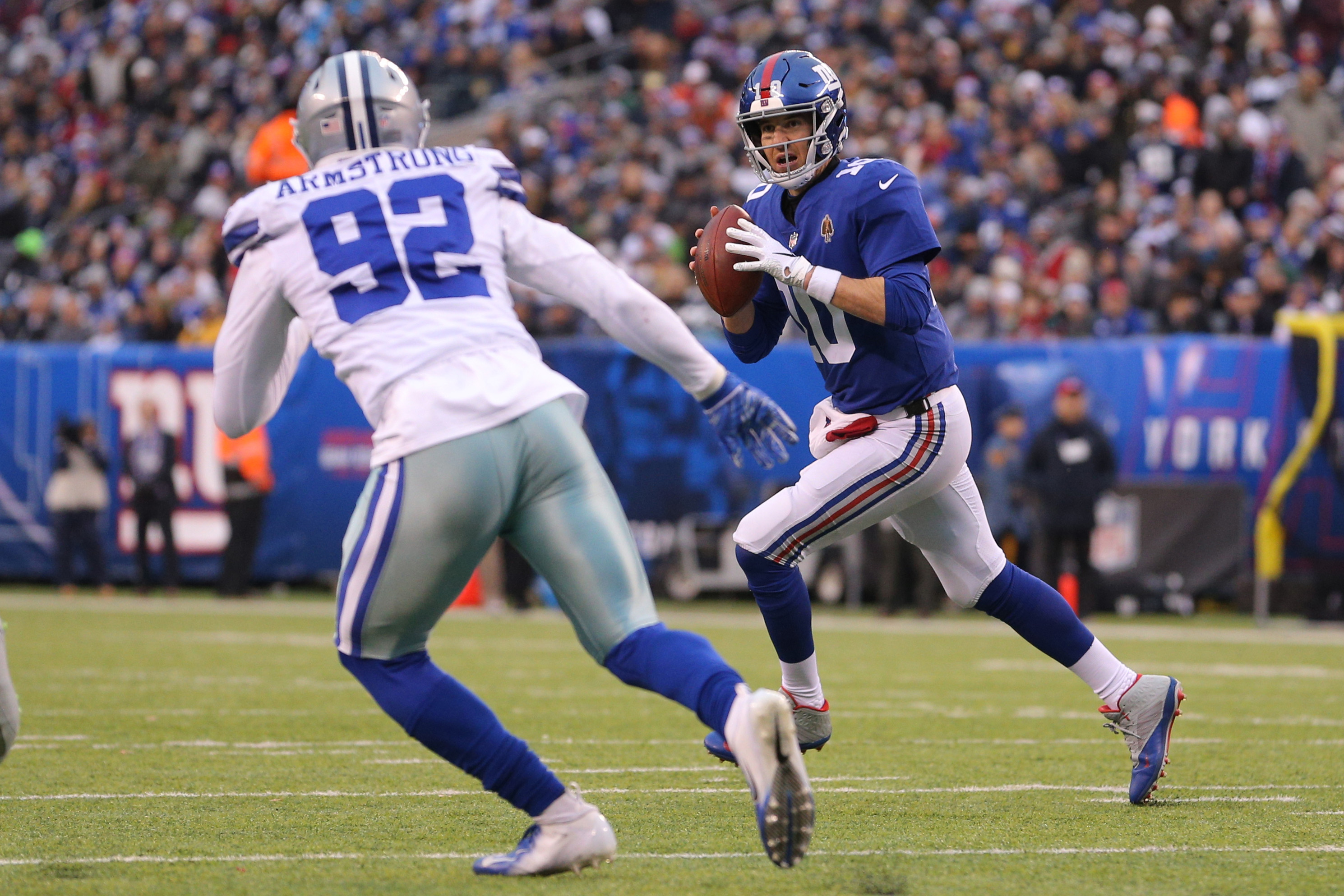 New York Giants quarterback Eli Manning looks to pass against Dallas Cowboys defensive end Dorance Armstrong during the third quarter at MetLife Stadium. / Brad Penner/USA TODAY Sports