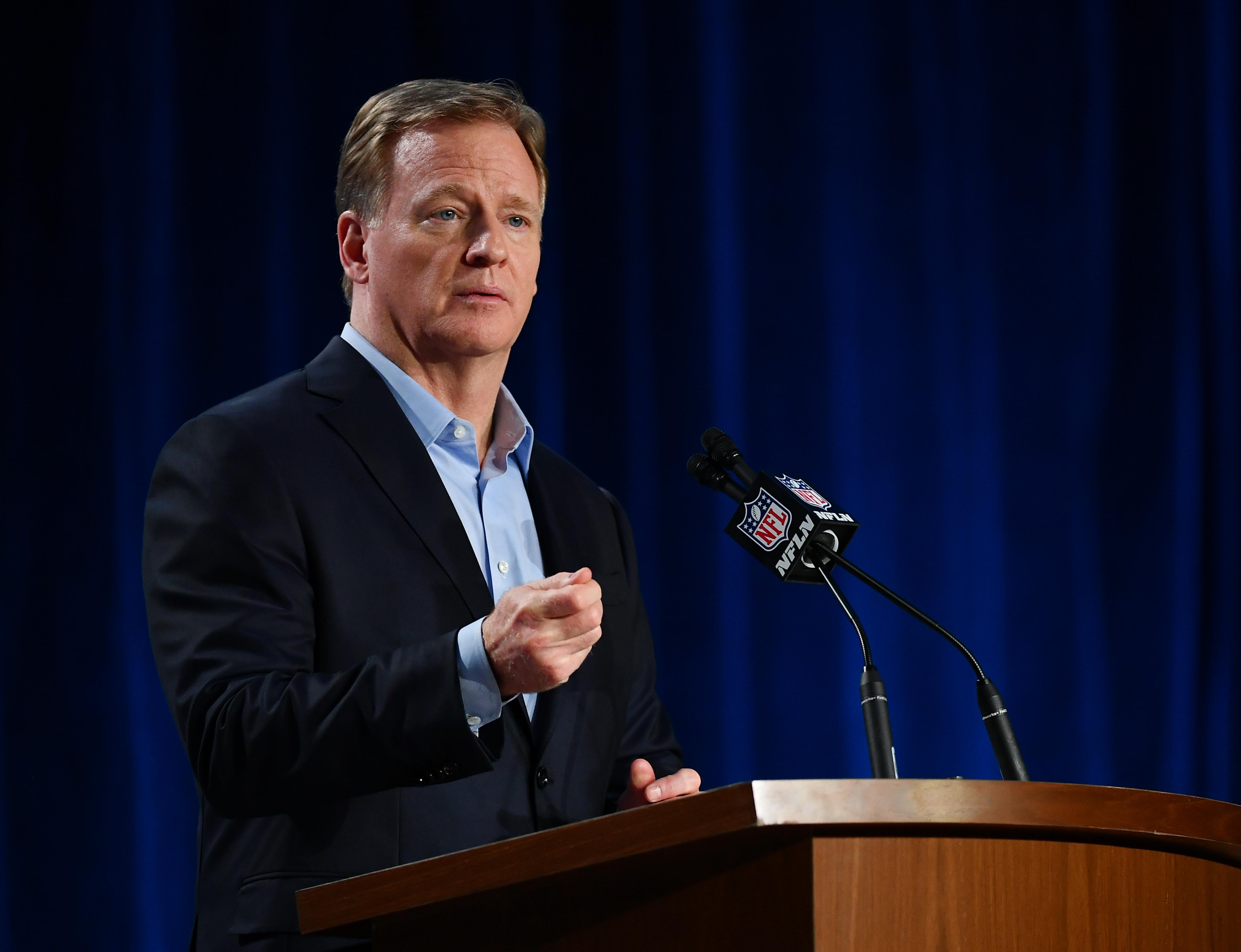 Jan 29, 2020; Miami, Florida, USA; NFL commissioner Roger Goodell during a press conference before Super Bowl LIV at Hilton Downtown. Mandatory Credit: Jasen Vinlove-USA TODAY Sports / Jasen Vinlove