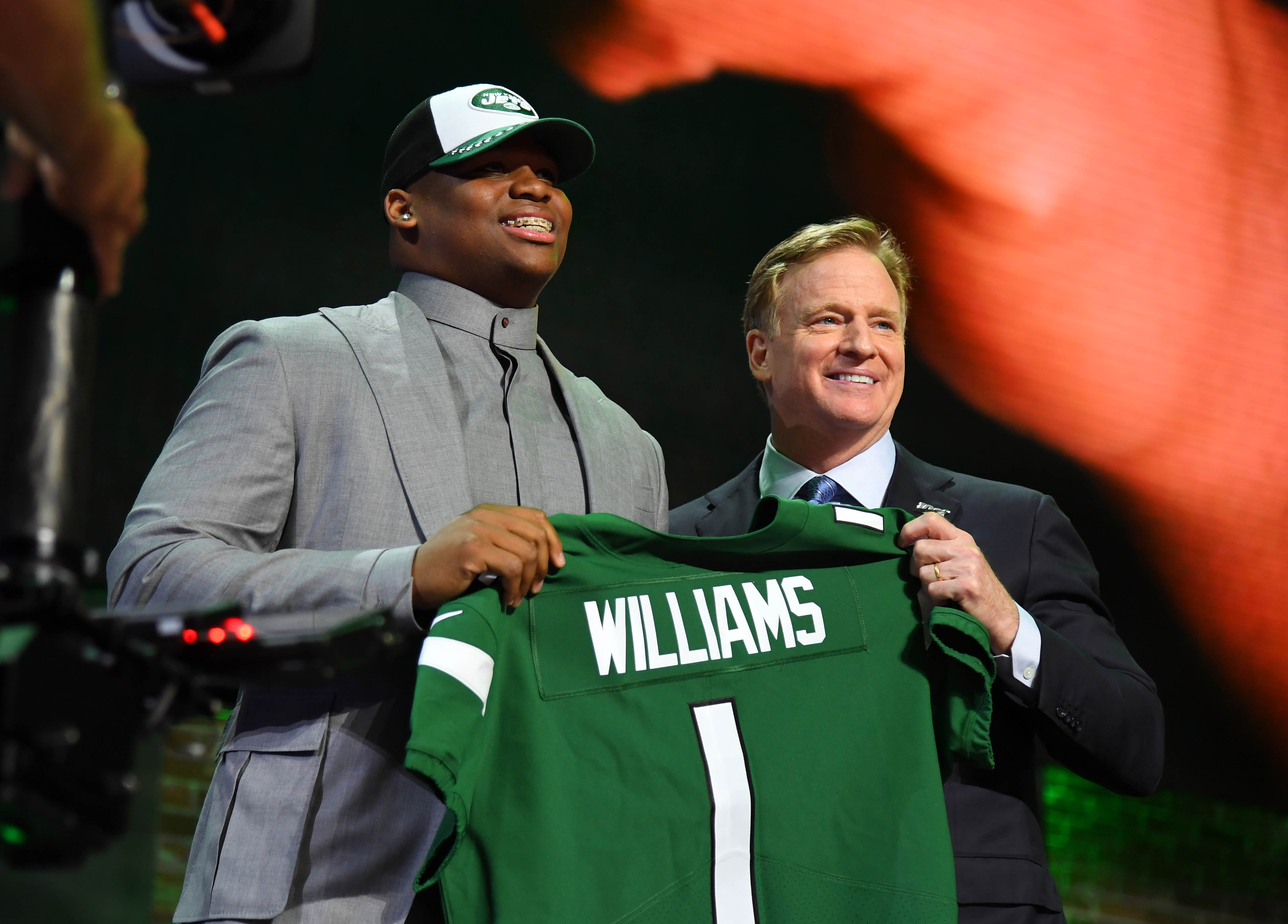 Apr 25, 2019; Nashville, TN, USA; Quinnen Williams (Alabama) stands with NFL commissioner Roger Goodell after he was selected as the number three overall pick to the New York Jets in the first round of the 2019 NFL Draft in Downtown Nashville. Mandatory Credit: Christopher Hanewinckel-USA TODAY Sports / Christopher Hanewinckel