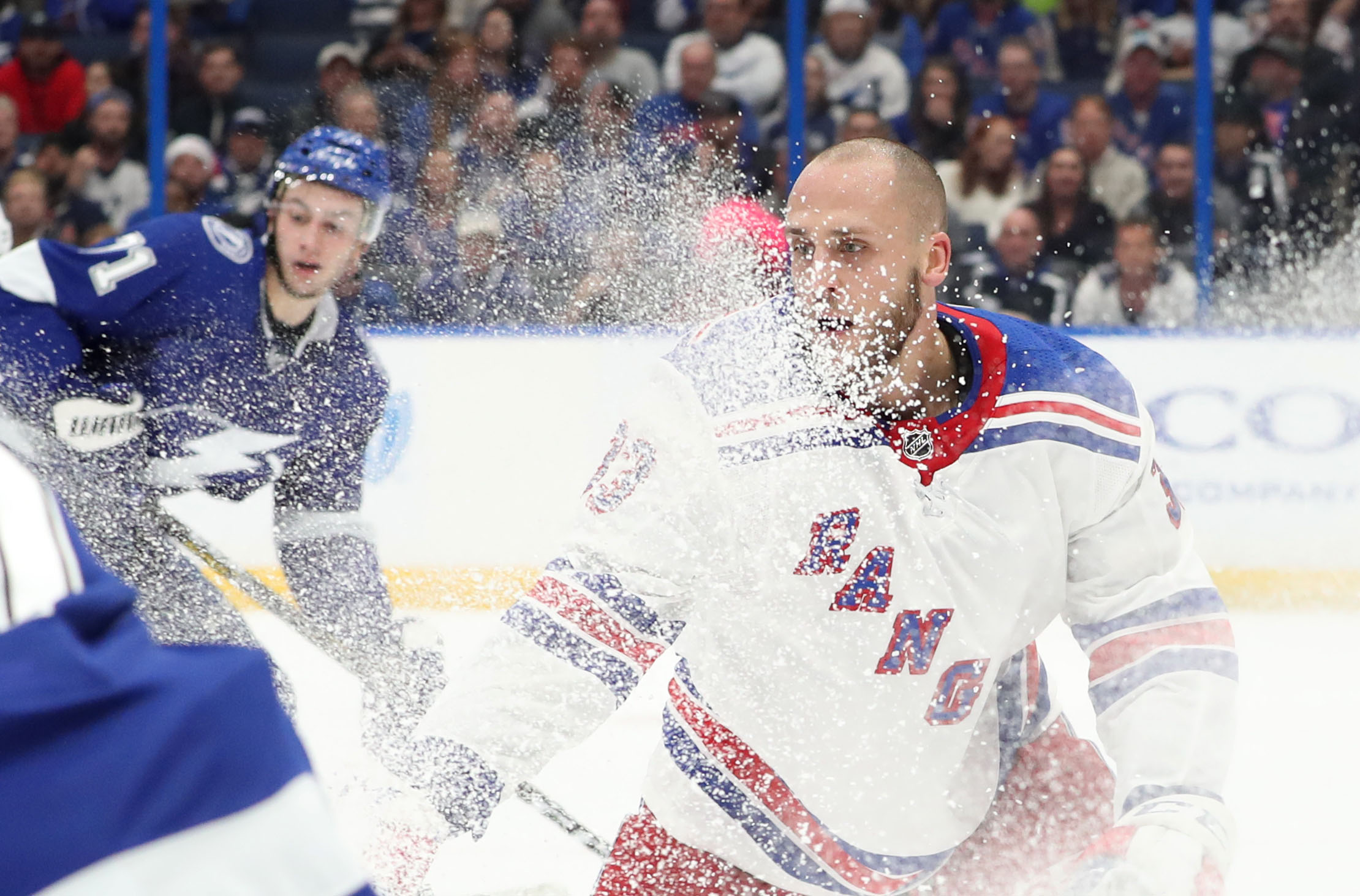 Dec 10, 2018; Tampa, FL, USA; New York Rangers defenseman Fredrik Claesson (33) skates without his helmet on against the Tampa Bay Lightning during the second period at Amalie Arena. Mandatory Credit: Kim Klement-USA TODAY Sports / Kim Klement