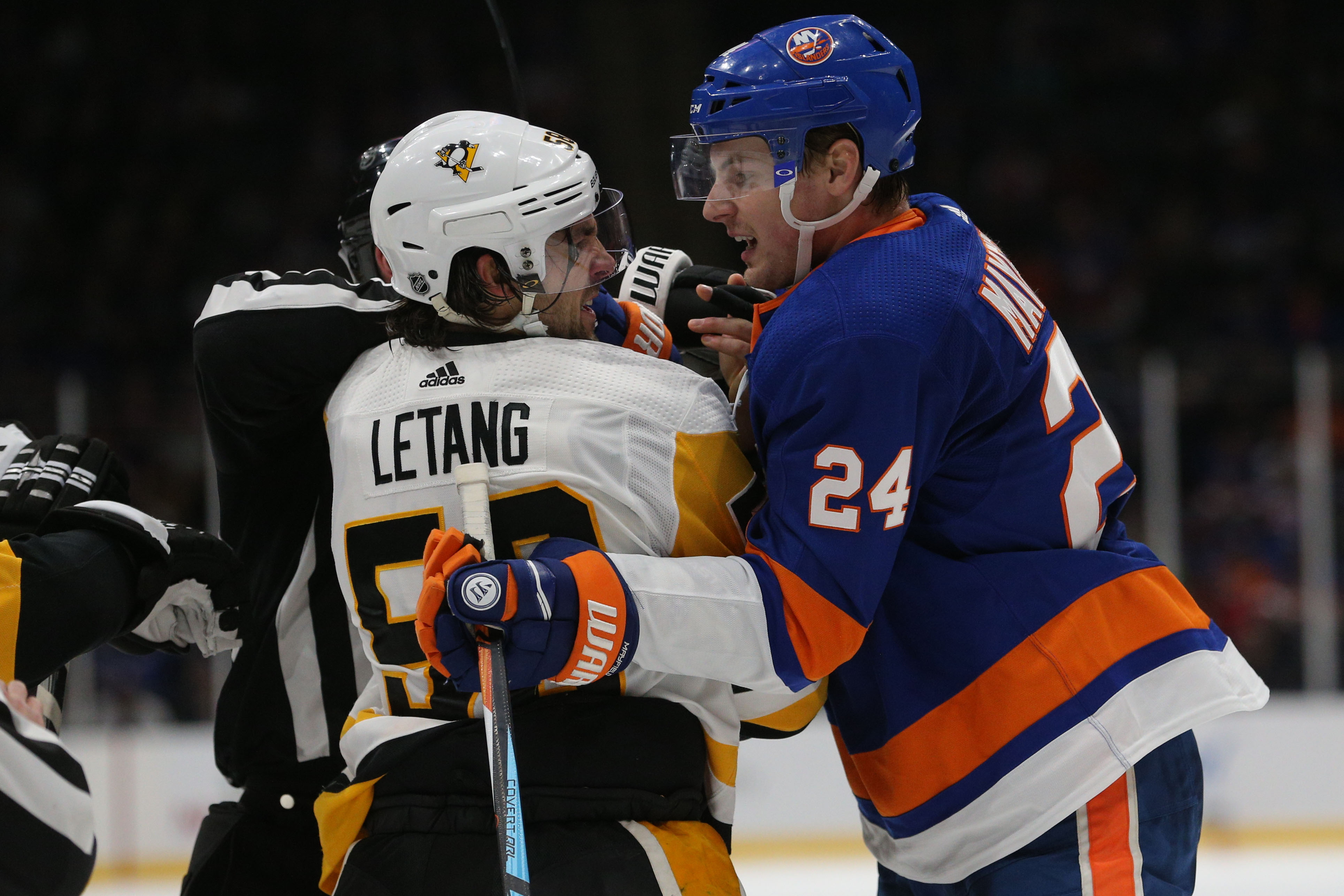 Dec 10, 2018; Uniondale, NY, USA; Pittsburgh Penguins defenseman Kris Letang (58) exchanges words with New York Islanders defenseman Scott Mayfield (24) during the third period at Nassau Veterans Memorial Coliseum. Mandatory Credit: Brad Penner-USA TODAY Sports / Brad Penner