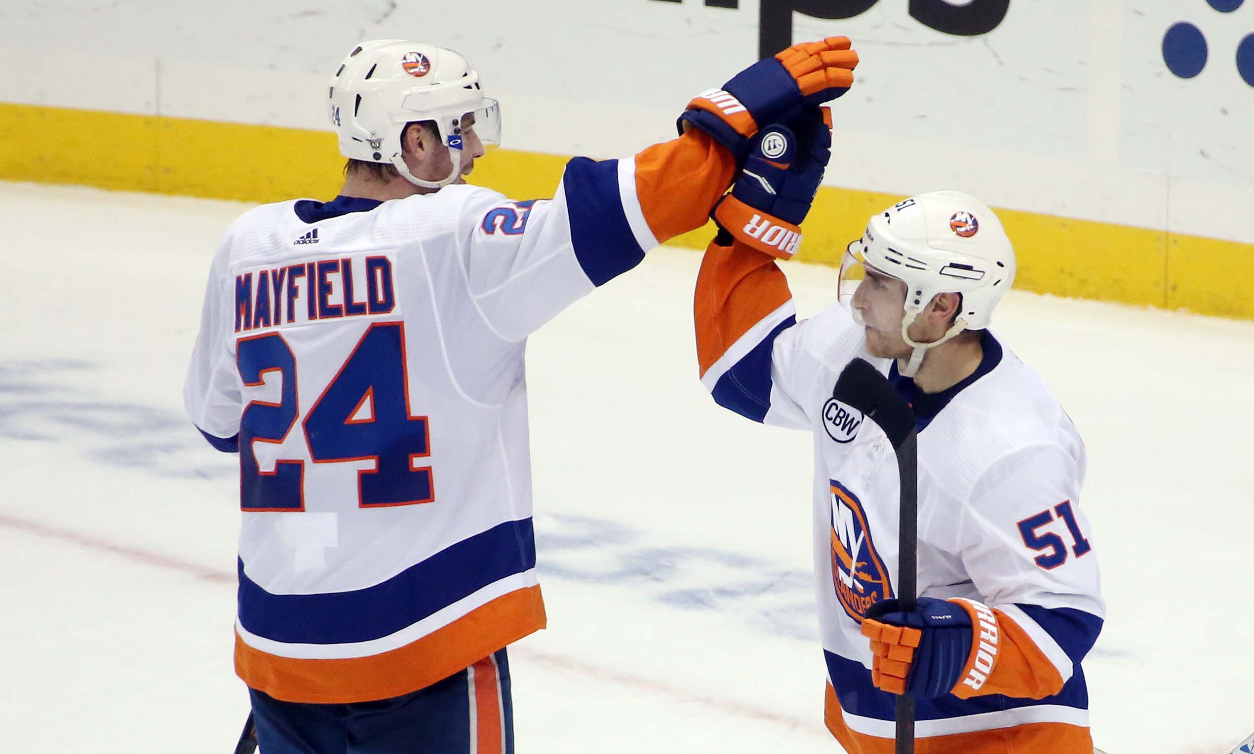 New York Islanders defenseman Scott Mayfield and center Valtteri Filppula high-five after defeating the Pittsburgh Penguins in Game 4 of the first round of the 2019 Stanley Cup Playoffs at PPG PAINTS Arena. / Charles LeClaire/USA TODAY Sports