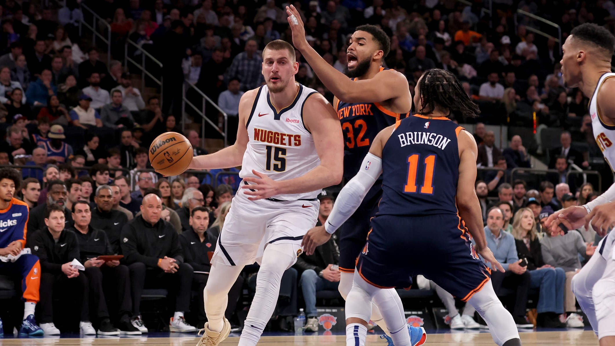 Nikola Jokic calls Knicks a top-five NBA title contender after off night against New York's defense'They’re a really good team'1/30/2025, 6:06 AMIan BegleyNBA InsiderJan 29, 2025; New York, New York, USA; Denver Nuggets center Nikola Jokic (15) and New York Knicks center Karl-Anthony Towns (32) react during the fourth quarter at Madison Square Garden. / Brad Penner-Imagn Images