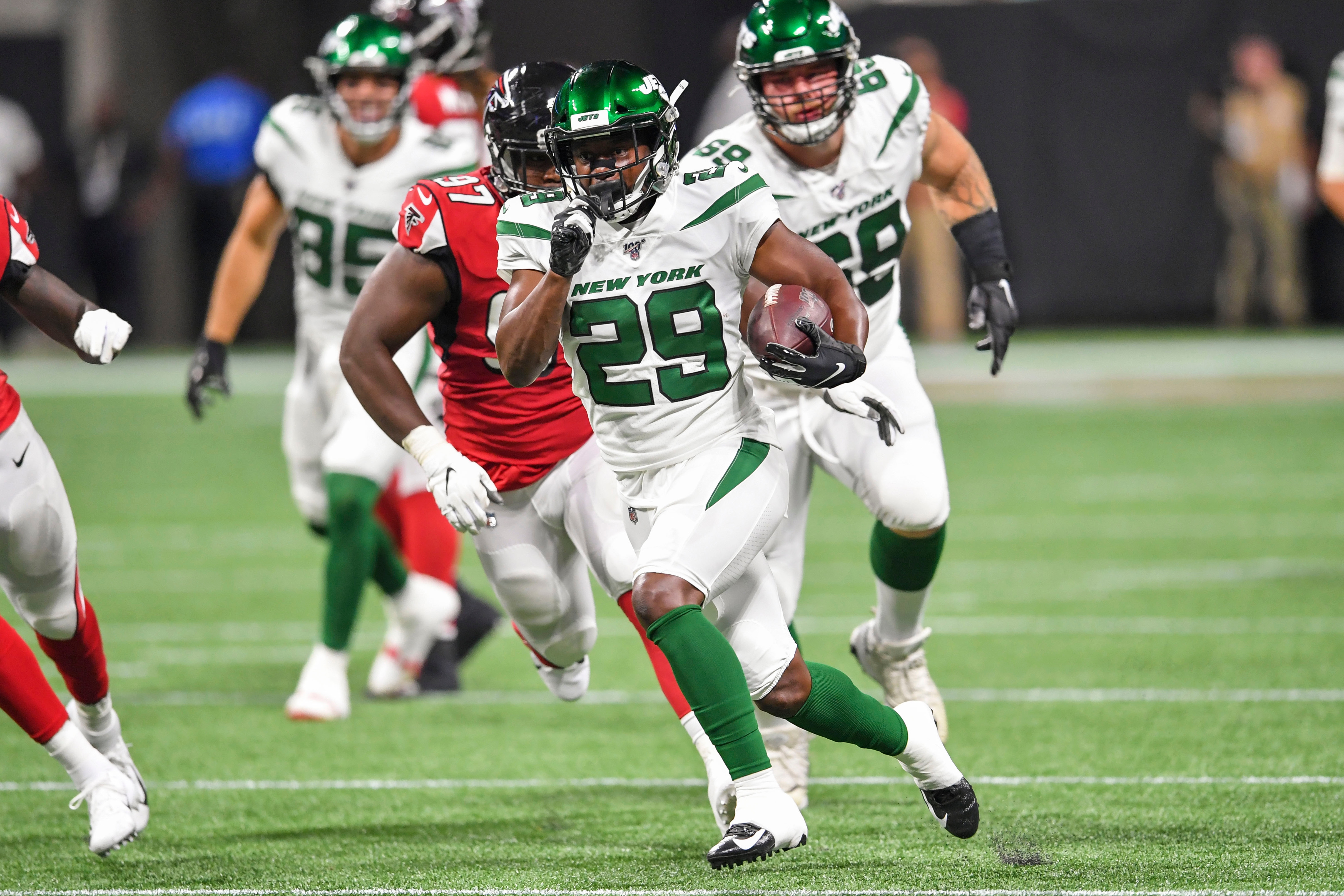 Aug 15, 2019; Atlanta, GA, USA; New York Jets running back Bilal Powell (29) runs against the Atlanta Falcons during the first half at Mercedes-Benz Stadium. Mandatory Credit: Dale Zanine-USA TODAY Sports / Dale Zanine