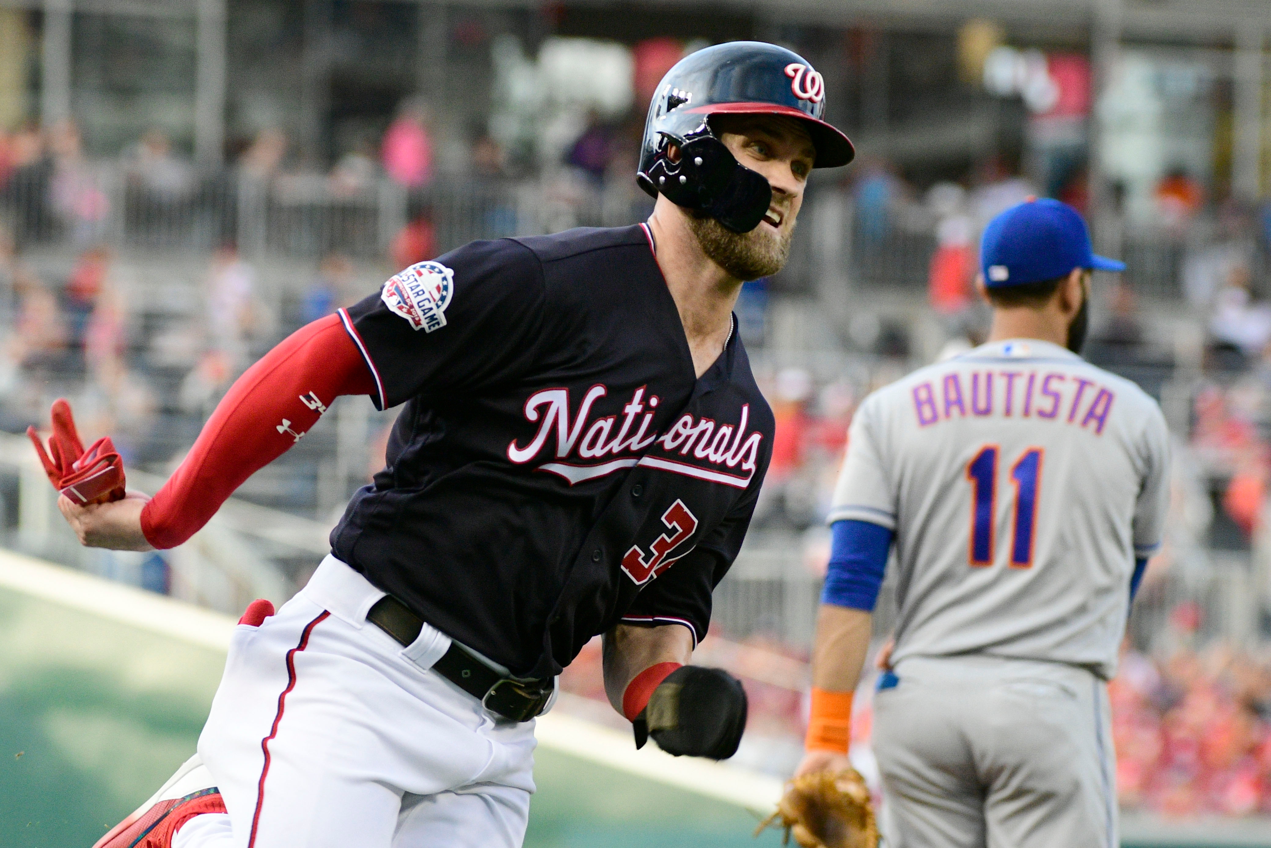 Jul 31, 2018; Washington, DC, USA; Washington Nationals right fielder Bryce Harper (34) runs home to score on first baseman Ryan Zimmerman (11) first inning single against the New York Mets at Nationals Park. Mandatory Credit: Tommy Gilligan-USA TODAY Sports / Tommy Gilligan