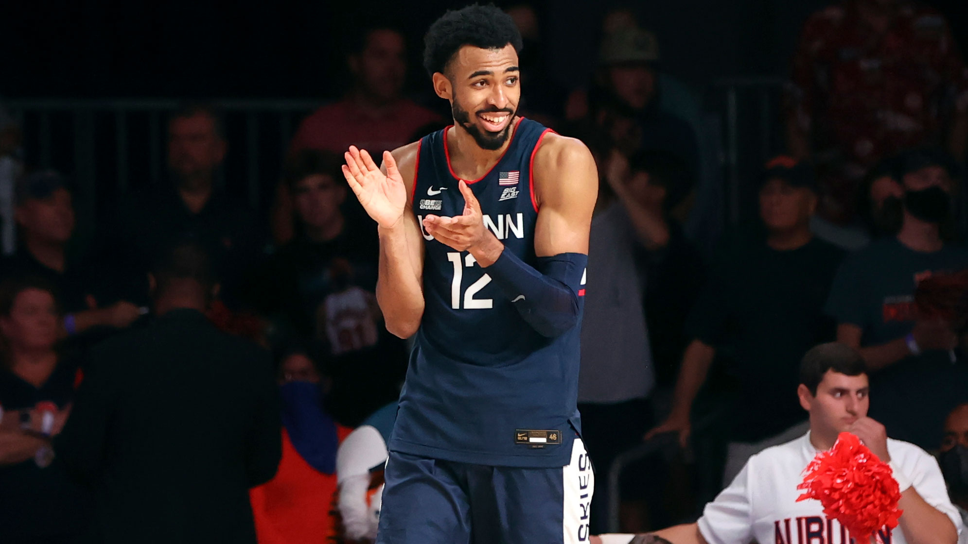 Nov 24, 2021; Nassau, BHS; Connecticut Huskies forward Tyler Polley (12) reacts against the Auburn Tigers during overtime in the 2021 Battle 4 Atlantis at Imperial Arena. / Kevin Jairaj-USA TODAY Sports