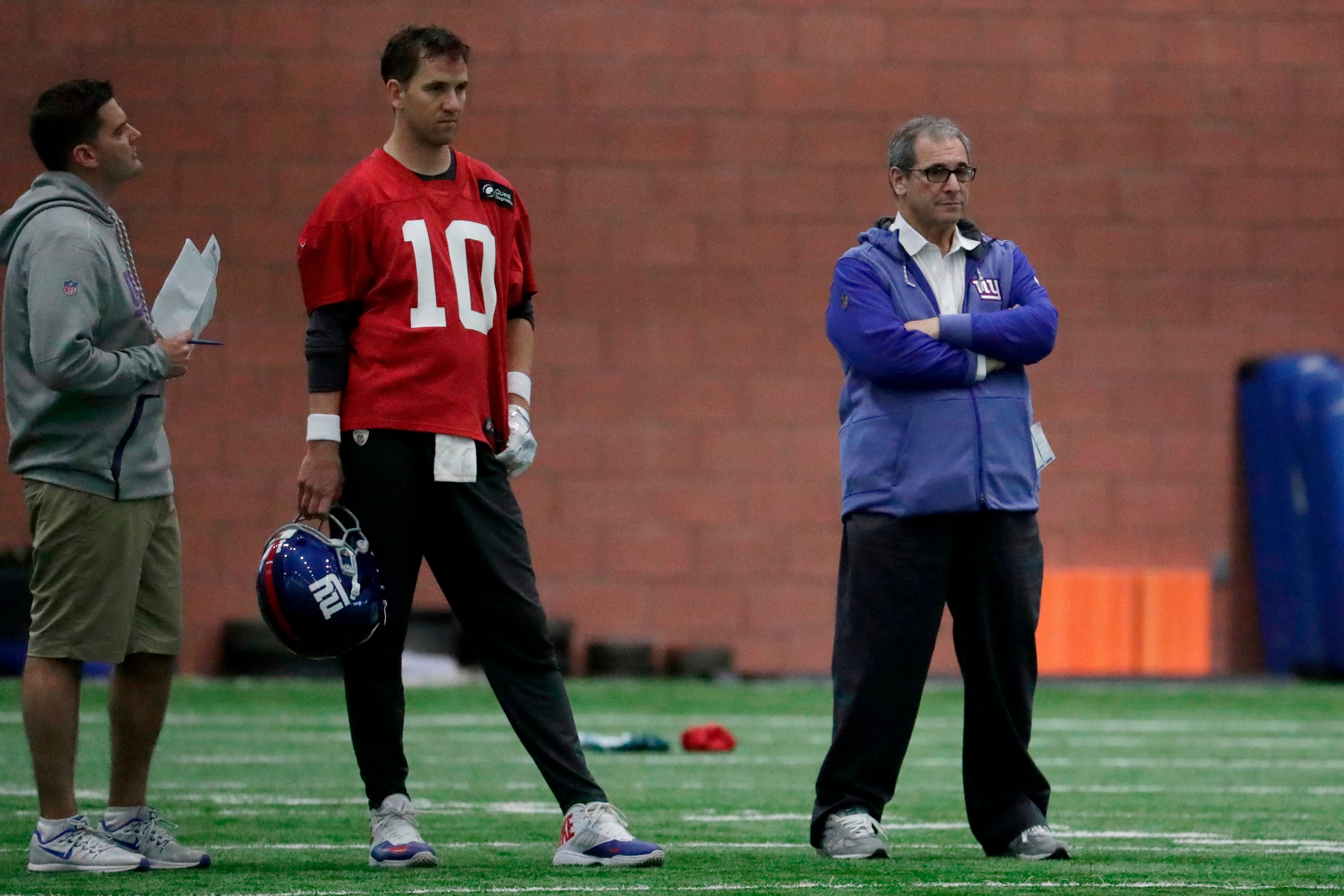 New York Giants quarterback Eli Manning (10) stands next to general manager Dave Gettleman during NFL football training camp, Wednesday, April 25, 2018, in East Rutherford, N.J. (AP Photo/Julio Cortez) / Julio Cortez/AP