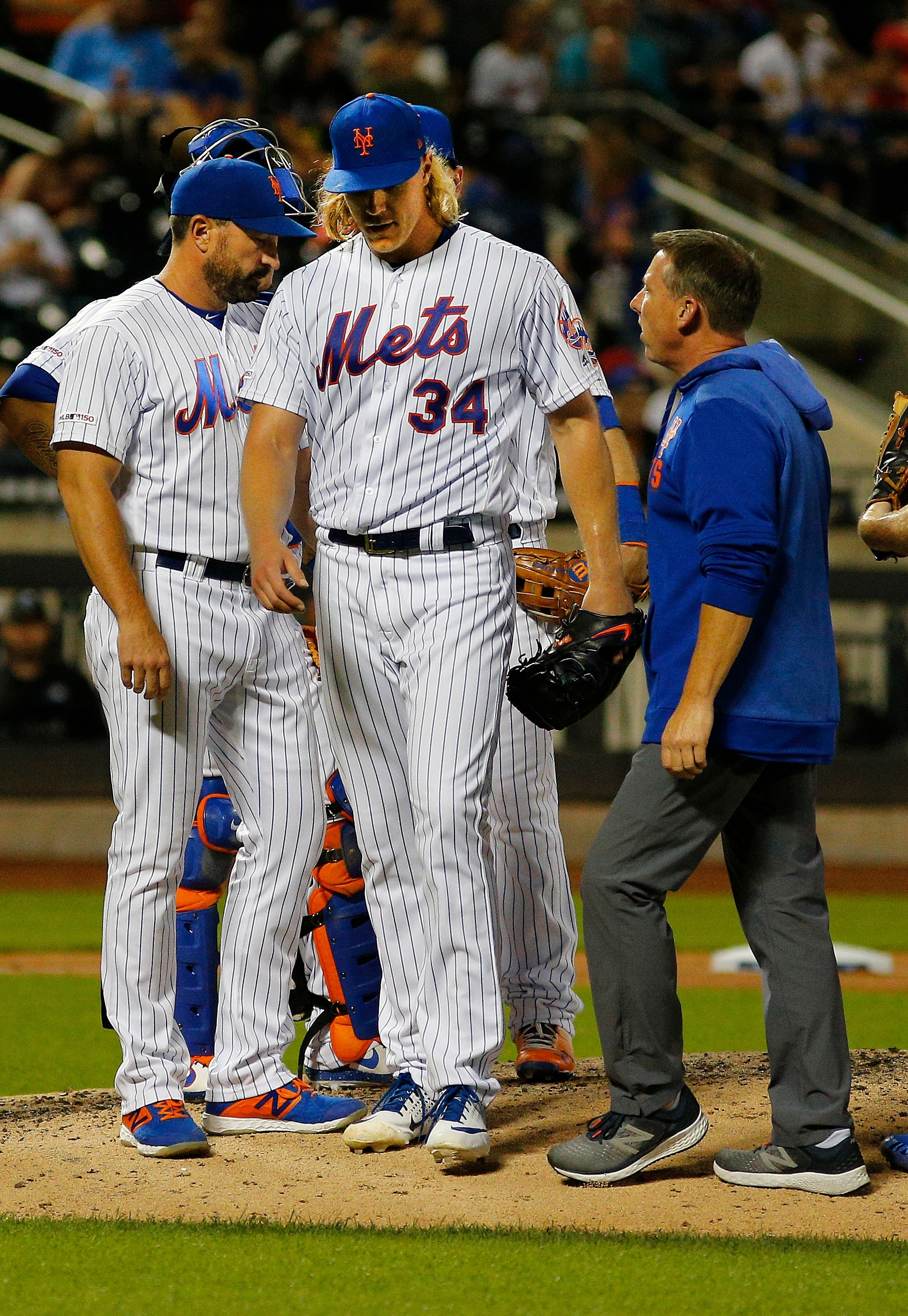 Jun 15, 2019; New York City, NY, USA; New York Mets starting pitcher Noah Syndergaard (34) leaves the field with trainer Brian Chicklo with an injury during the seventh inning against the St. Louis Cardinals at Citi Field. Mandatory Credit: Andy Marlin-USA TODAY Sports / Andy Marlin