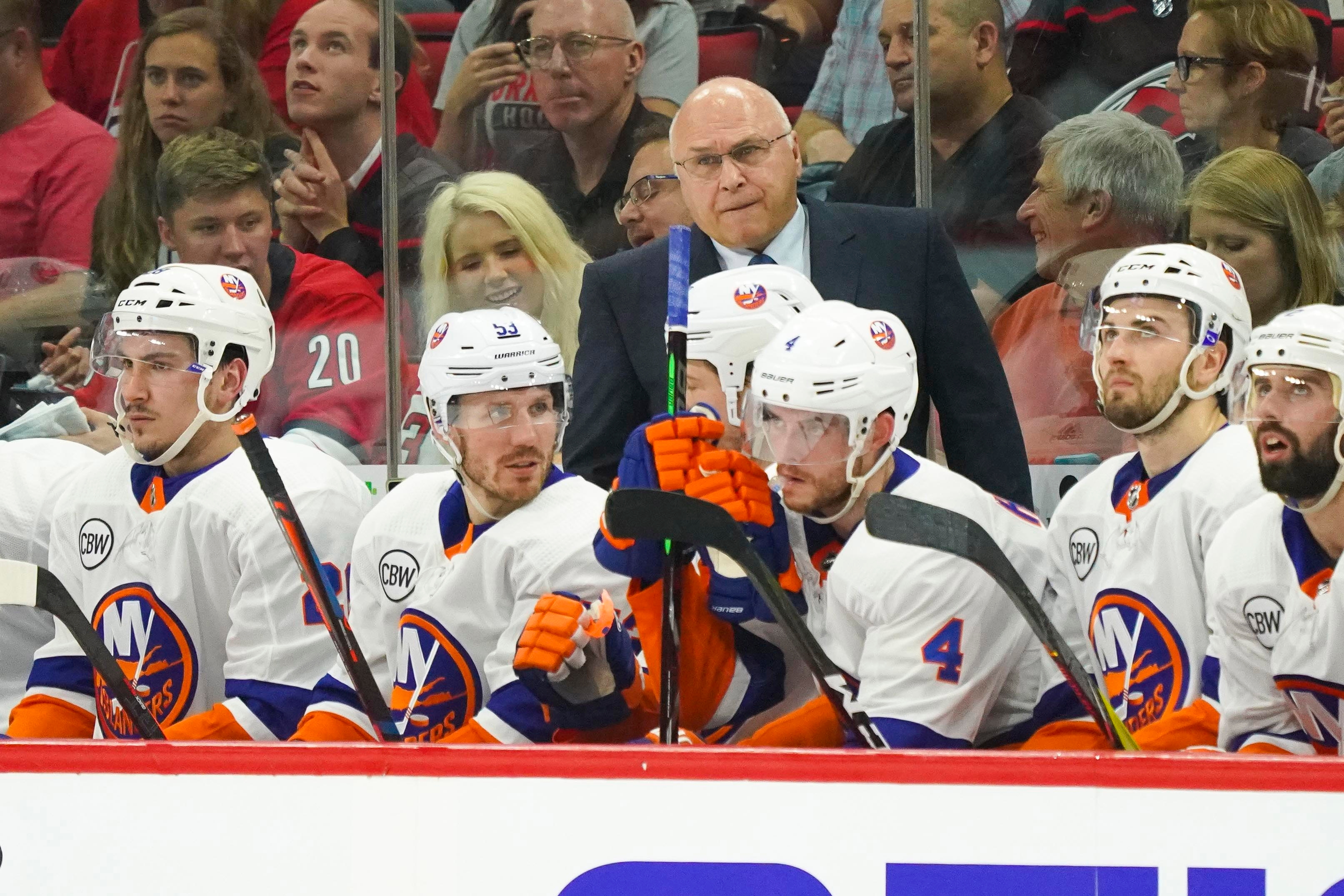 May 3, 2019; Raleigh, NC, USA; New York Islanders head coach Barry Trotz looks on from behind the players bench against the Carolina Hurricanes during the third period in game four of the second round of the 2019 Stanley Cup Playoffs at PNC Arena. The Carolina Hurricanes defeated the New York Islanders 5-2. Mandatory Credit: James Guillory-USA TODAY Sports / James Guillory