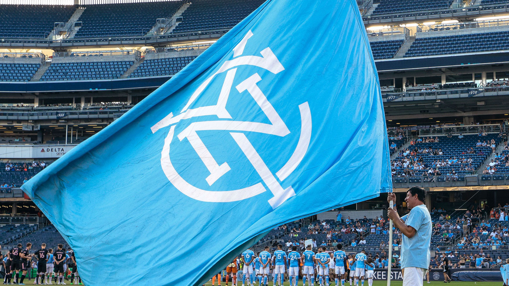 Jul 23, 2022; New York, New York, USA; A fan holds a NYCFC flag on the pitch before a match between New York City FC and Inter Miami CF at Yankee Stadium. / Vincent Carchietta-USA TODAY Sports