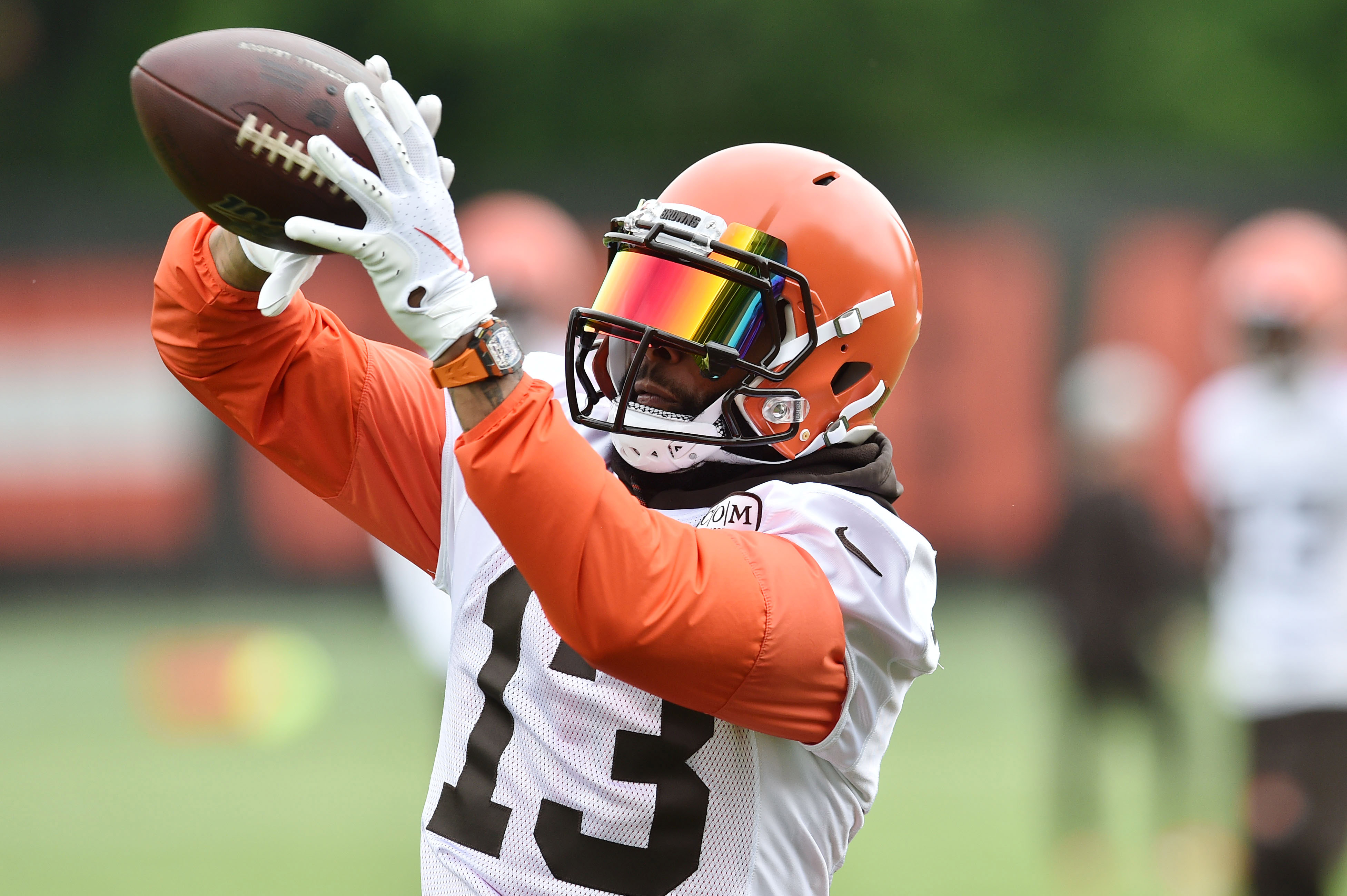 Jun 4, 2019; Berea, OH, USA; Cleveland Browns wide receiver Odell Beckham Jr. (13) makes a catch during minicamp at the Cleveland Browns training facility. Mandatory Credit: Ken Blaze-USA TODAY Sports / Ken Blaze