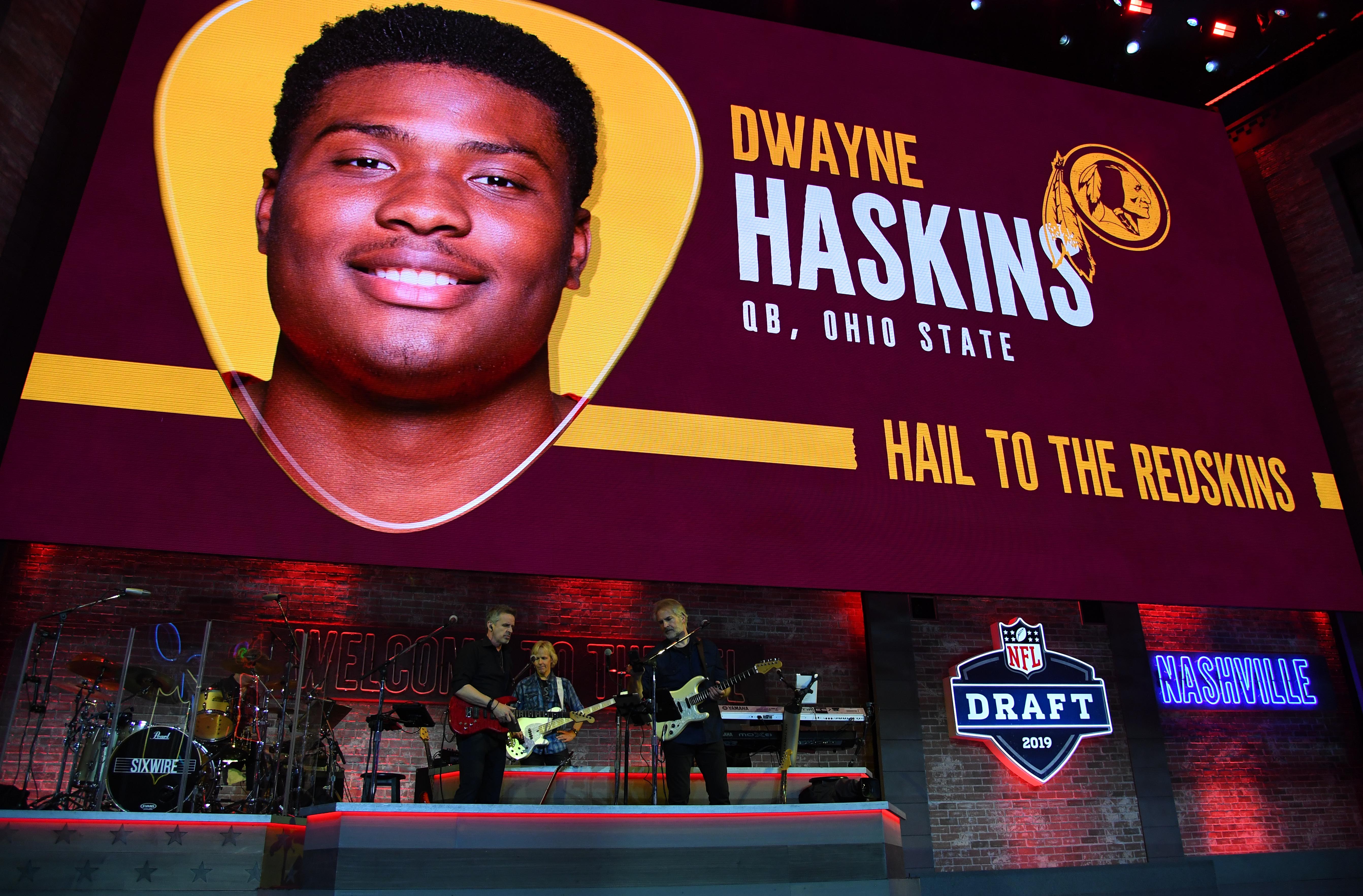 Apr 25, 2019; Nashville, TN, USA; Graphic of Dwayne Haskins (Ohio State) is selected as the number fifteen overall pick to the Washington Redskins in the first round of the 2019 NFL Draft in Downtown Nashville. Haskins was not in attendance. Mandatory Credit: Christopher Hanewinckel-USA TODAY Sports / Christopher Hanewinckel