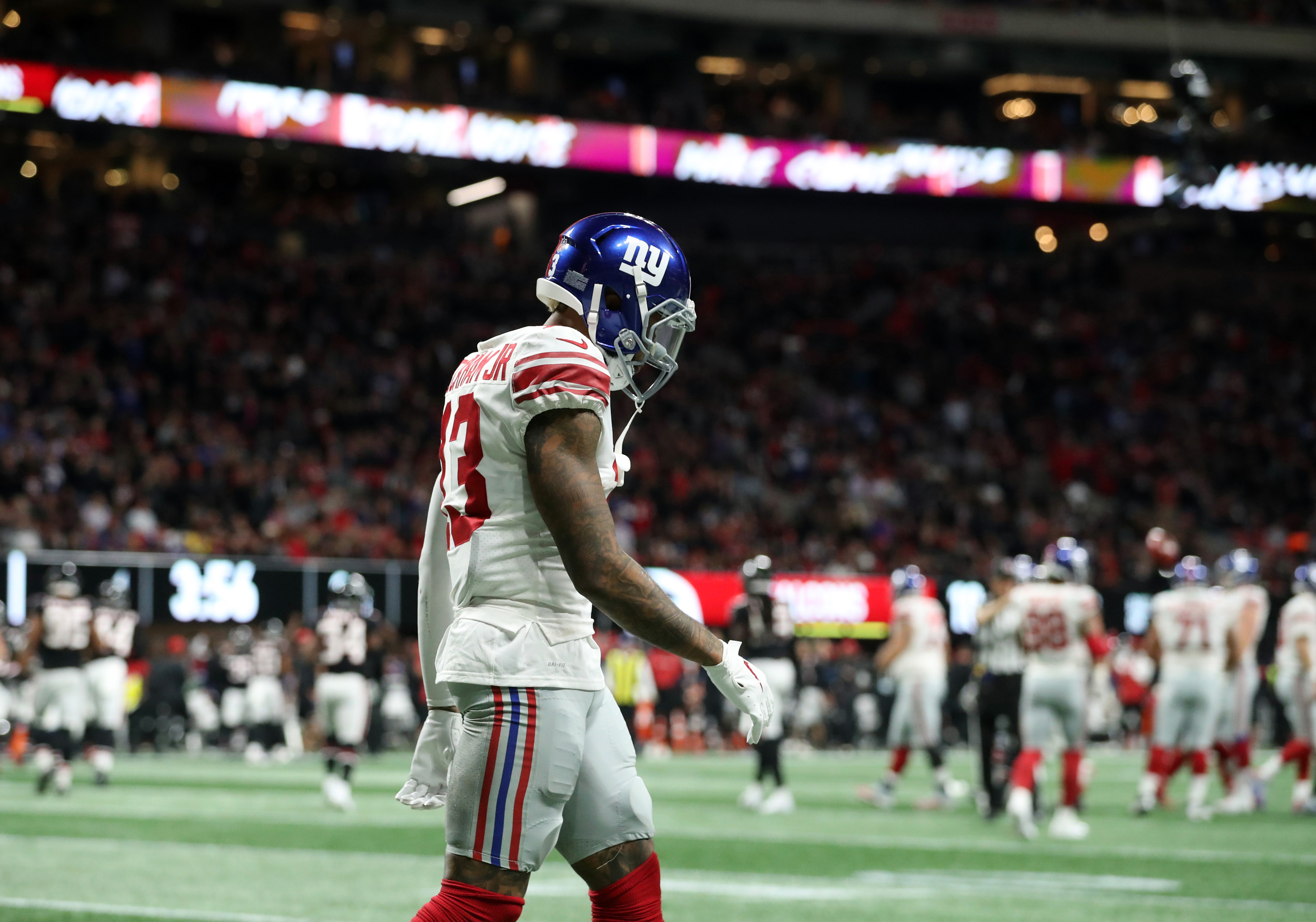 Oct 22, 2018; Atlanta, GA, USA; New York Giants wide receiver Odell Beckham (13) reacts after the offense was unable to convert a third down in the third quarter against the Atlanta Falcons at Mercedes-Benz Stadium. Mandatory Credit: Jason Getz-USA TODAY Sports / Jason Getz