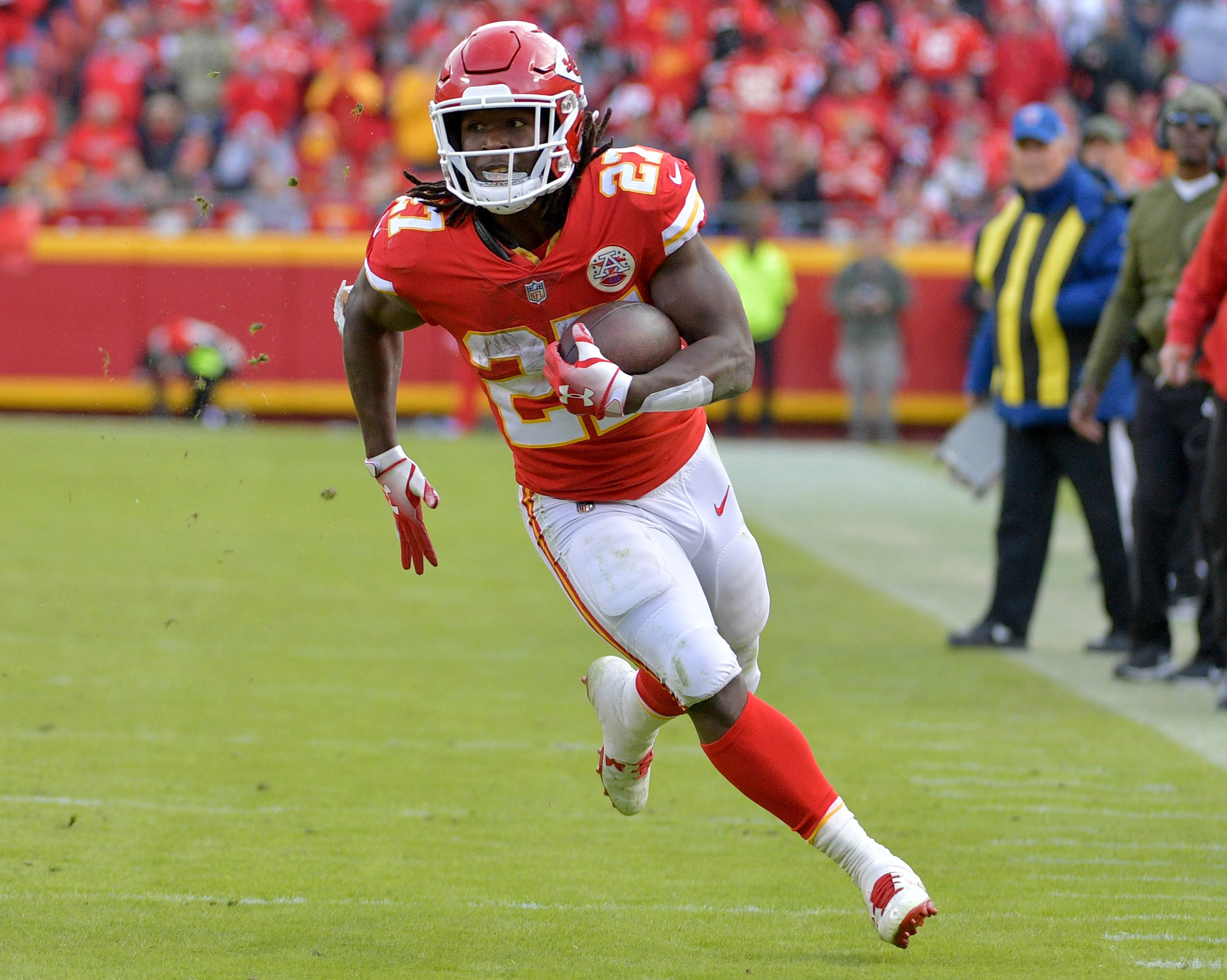 Nov 11, 2018; Kansas City, MO, USA; Kansas City Chiefs running back Kareem Hunt (27) runs the ball during the second half against the Arizona Cardinals at Arrowhead Stadium. The Chiefs won 26-14. Mandatory Credit: Denny Medley-USA TODAY Sports / Denny Medley