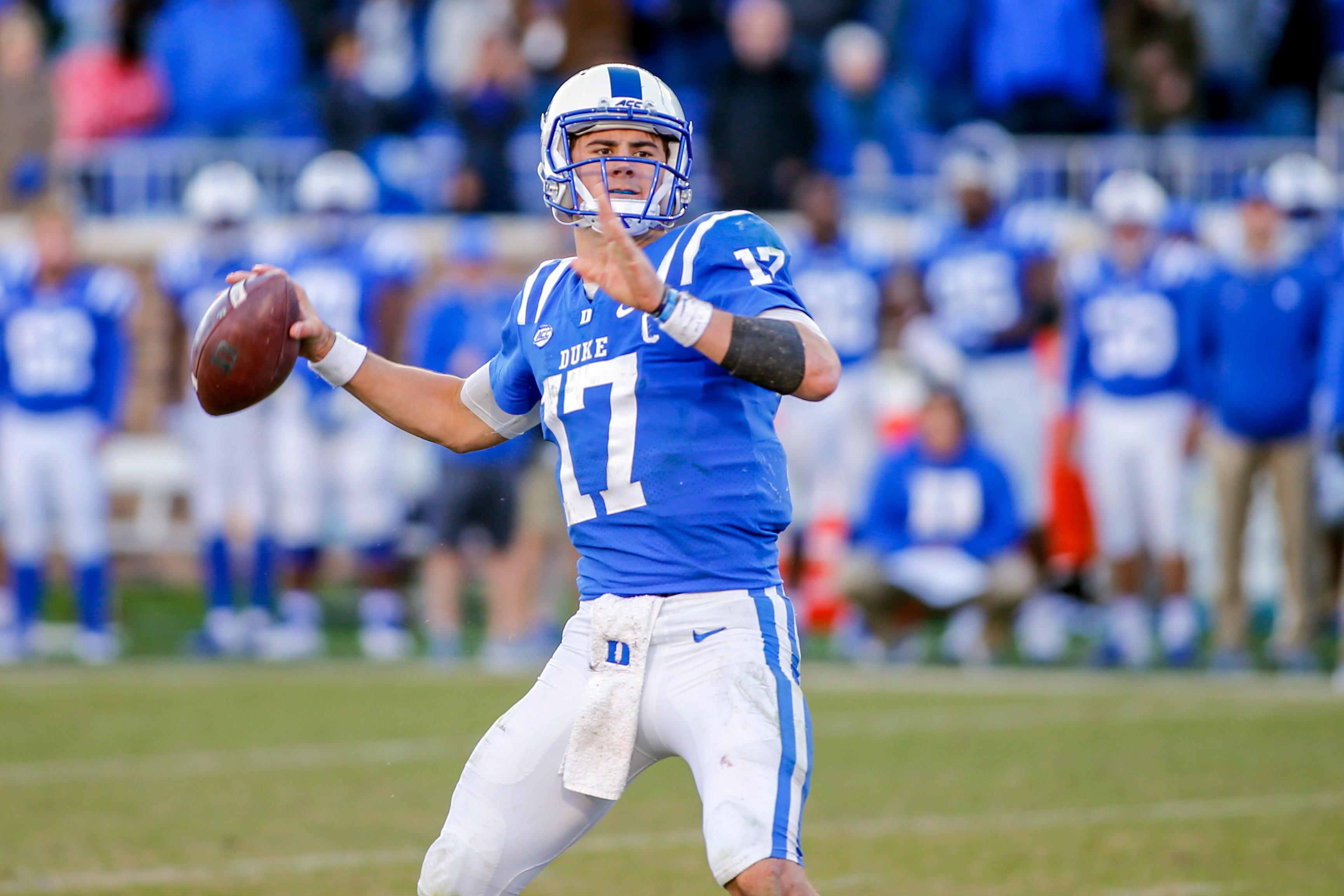 Nov 10, 2018; Durham, NC, USA; Duke Blue Devils quarterback Daniel Jones passes the football in the second half against the North Carolina Tar Heels at Wallace Wade Stadium. The Duke Blue Devils won 42-35. Mandatory Credit: Nell Redmond-USA TODAY Sports / Nell Redmond