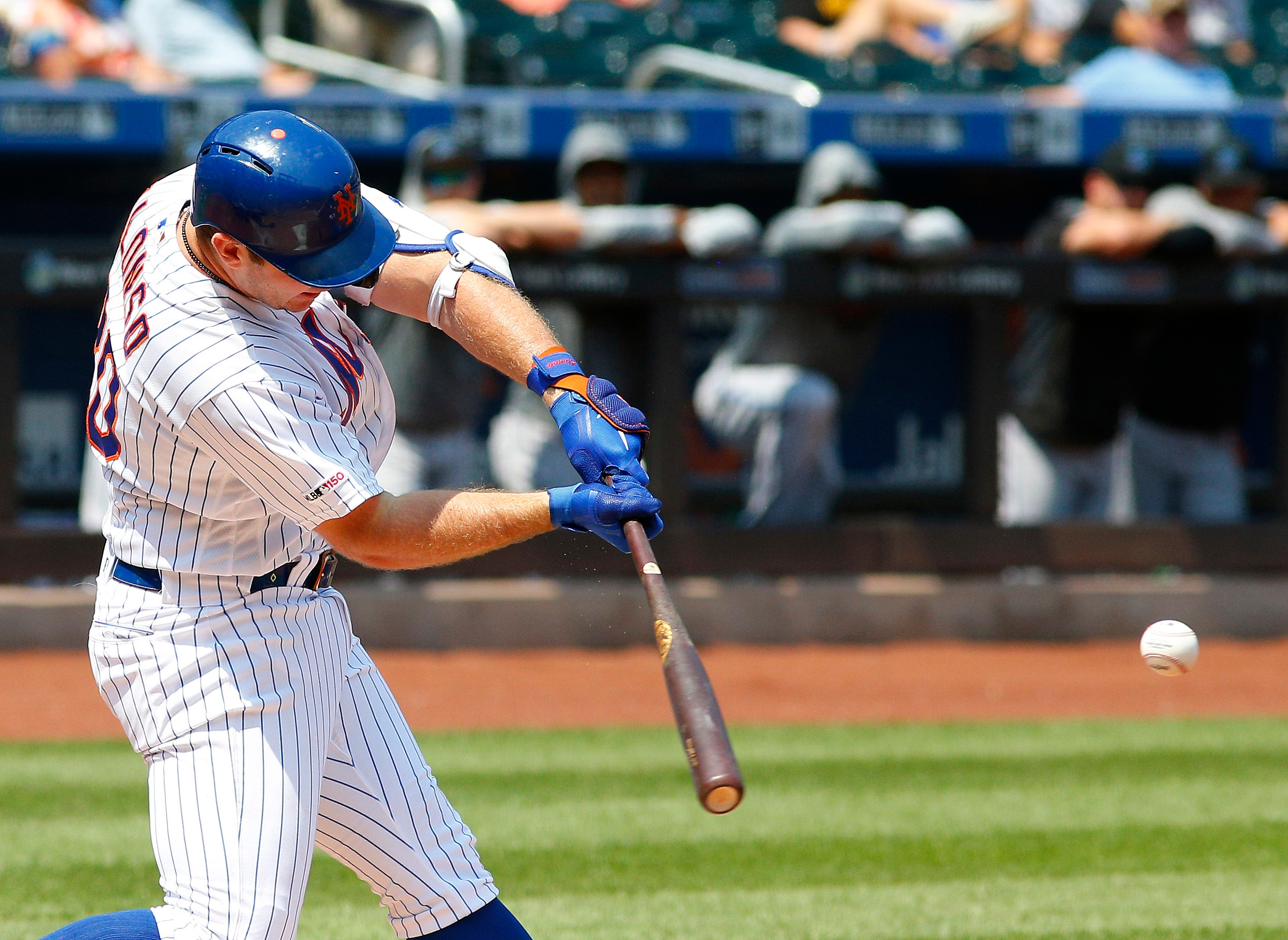 Aug 7, 2019; New York City, NY, USA; New York Mets first baseman Pete Alonso (20) hits a solo home run against the Miami Marlins during the first inning at Citi Field. Mandatory Credit: Andy Marlin-USA TODAY Sports / Andy Marlin