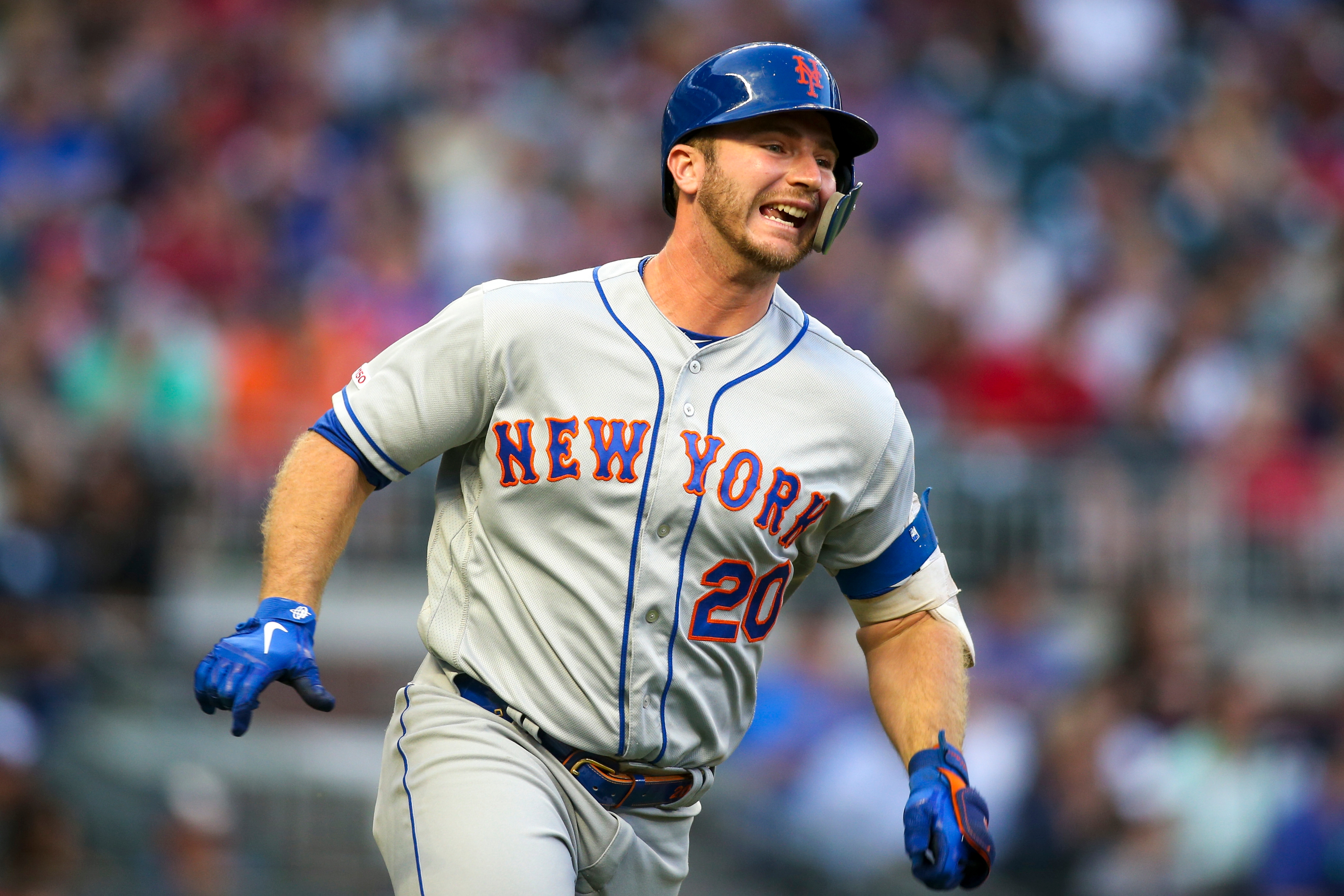 Apr 13, 2019; Atlanta, GA, USA; New York Mets first baseman Pete Alonso (20) hits a double against the Atlanta Braves in the first inning at SunTrust Park. Mandatory Credit: Brett Davis-USA TODAY Sports / Brett Davis