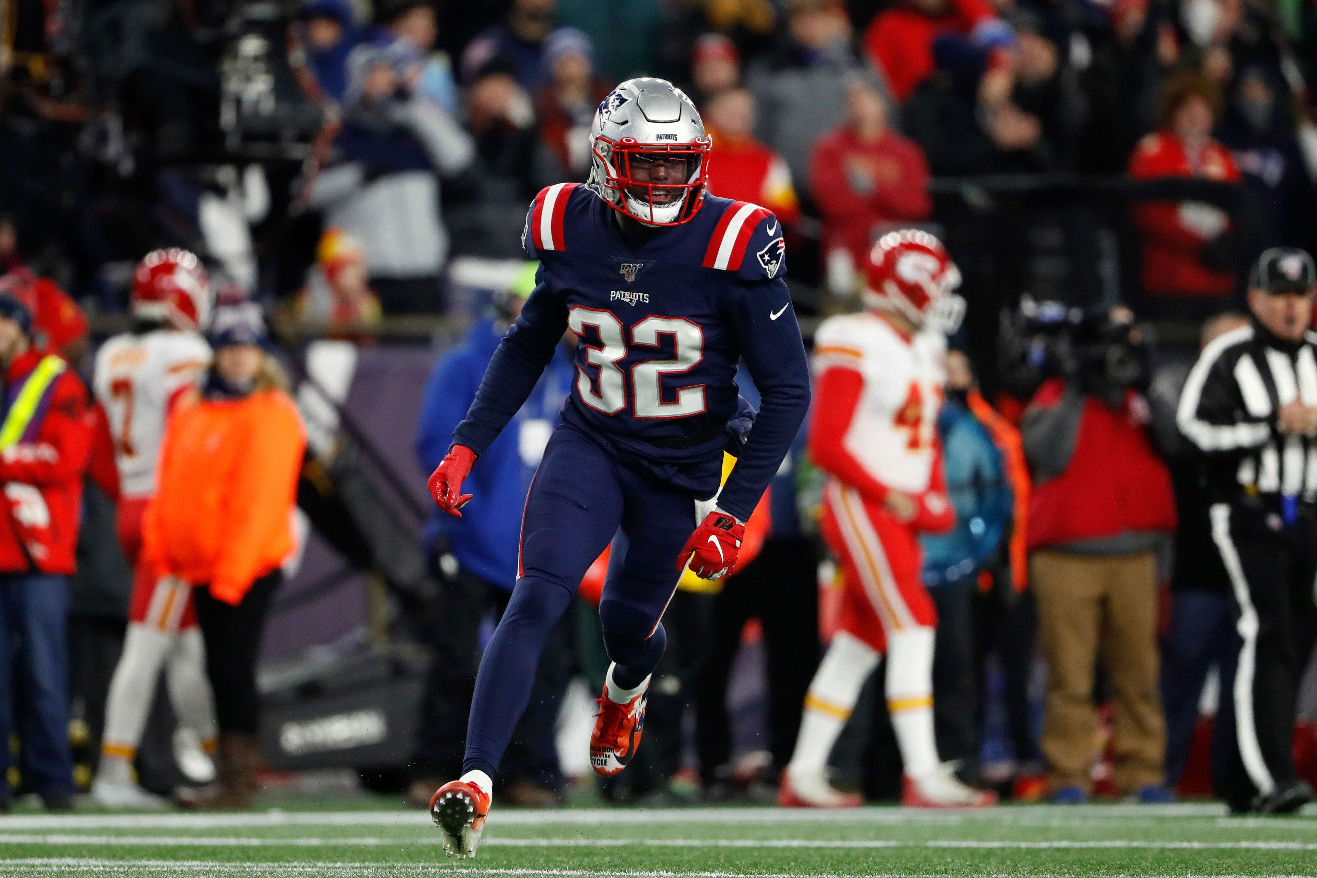 Dec 8, 2019; Foxborough, MA, USA; New England Patriots free safety Devin McCourty (32) during the second half against the Kansas City Chiefs at Gillette Stadium. Mandatory Credit: Winslow Townson-USA TODAY Sports / Winslow Townson