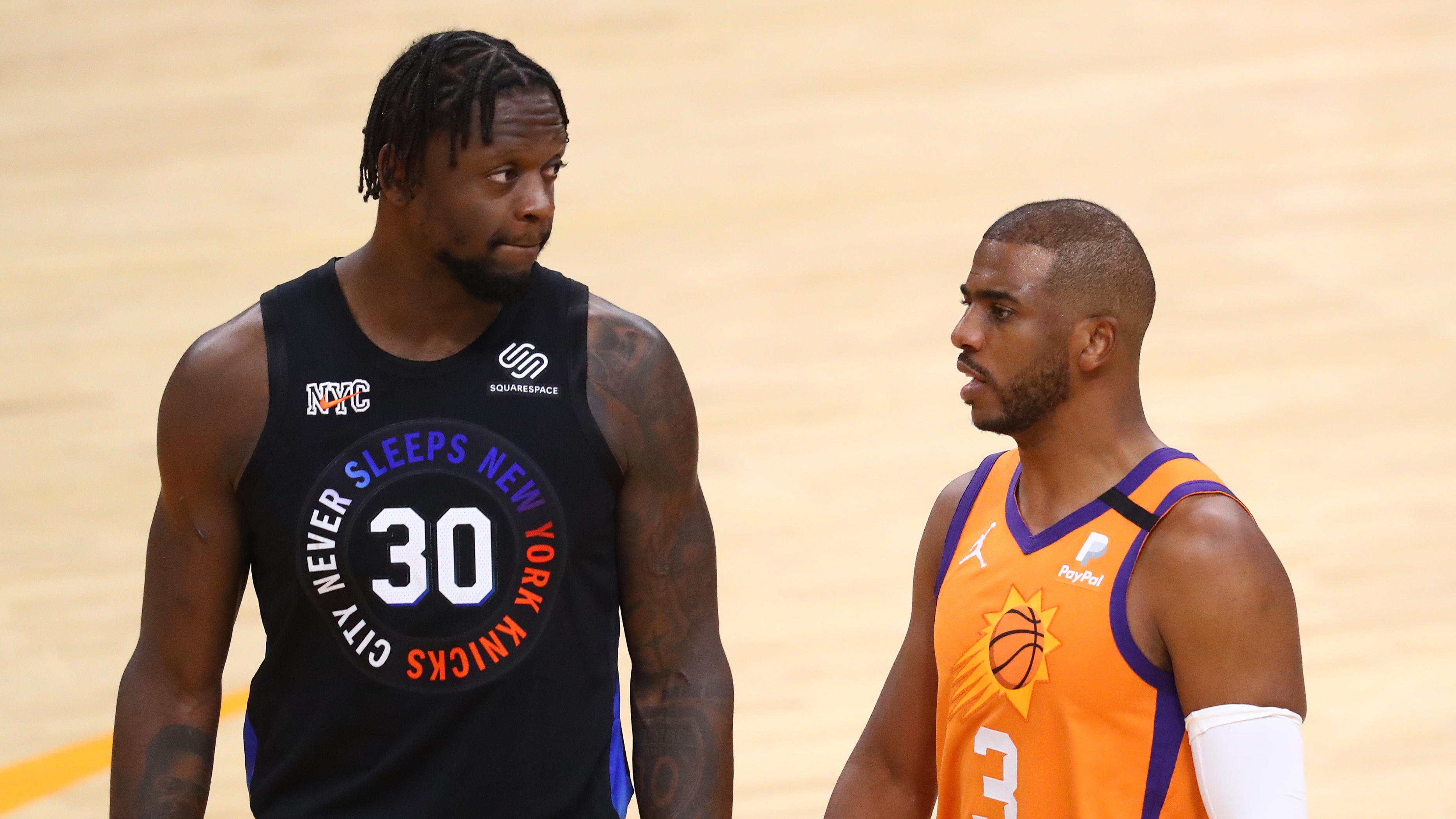 Potential Knicks target Chris Paul declines option, becomes free agent: reportUnder current deal, 11-time All-Star PG has $44 million salary for 2021-228/1/2021, 11:54 PMGarrett StepienFreelance Editorial ProducerMay 7, 2021; Phoenix, Arizona, USA; New York Knicks forward Julius Randle (30) against Phoenix Suns guard Chris Paul (3) at Phoenix Suns Arena. Mandatory Credit: Mark J. Rebilas-USA TODAY Sports / © Mark J. Rebilas-USA TODAY Sports