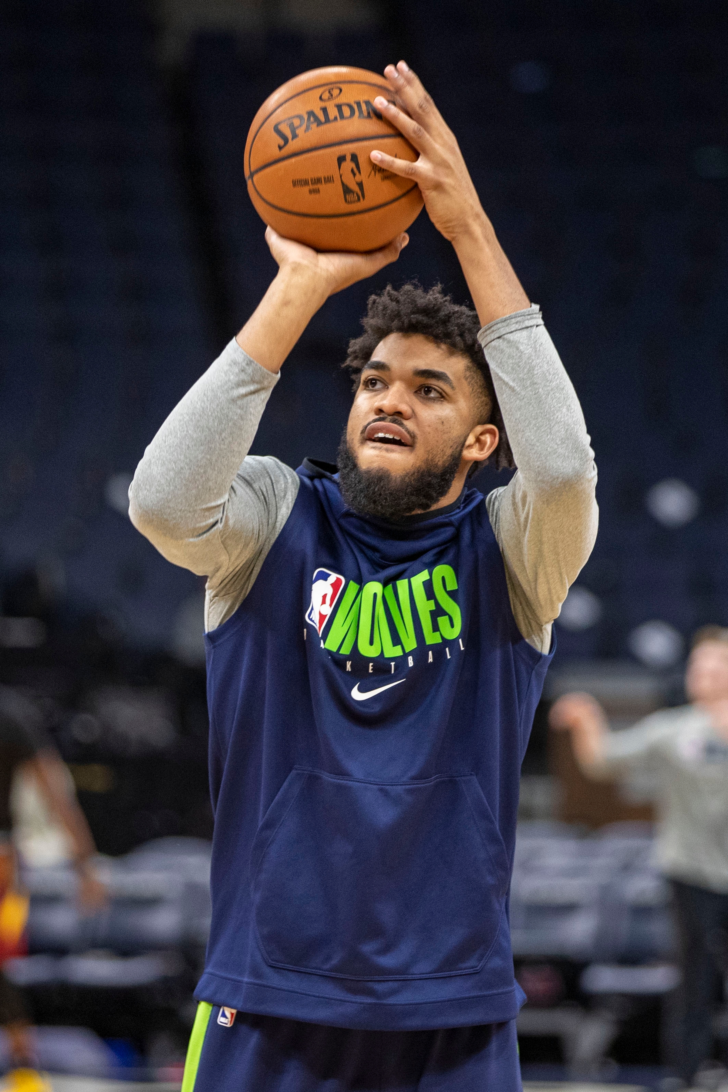 Dec 28, 2019; Minneapolis, Minnesota, USA; Minnesota Timberwolves center Karl-Anthony Towns (32) shoots the ball during pregame warmups before a game against the Cleveland Cavaliers at Target Center. Mandatory Credit: Jesse Johnson-USA TODAY Sports / Jesse Johnson