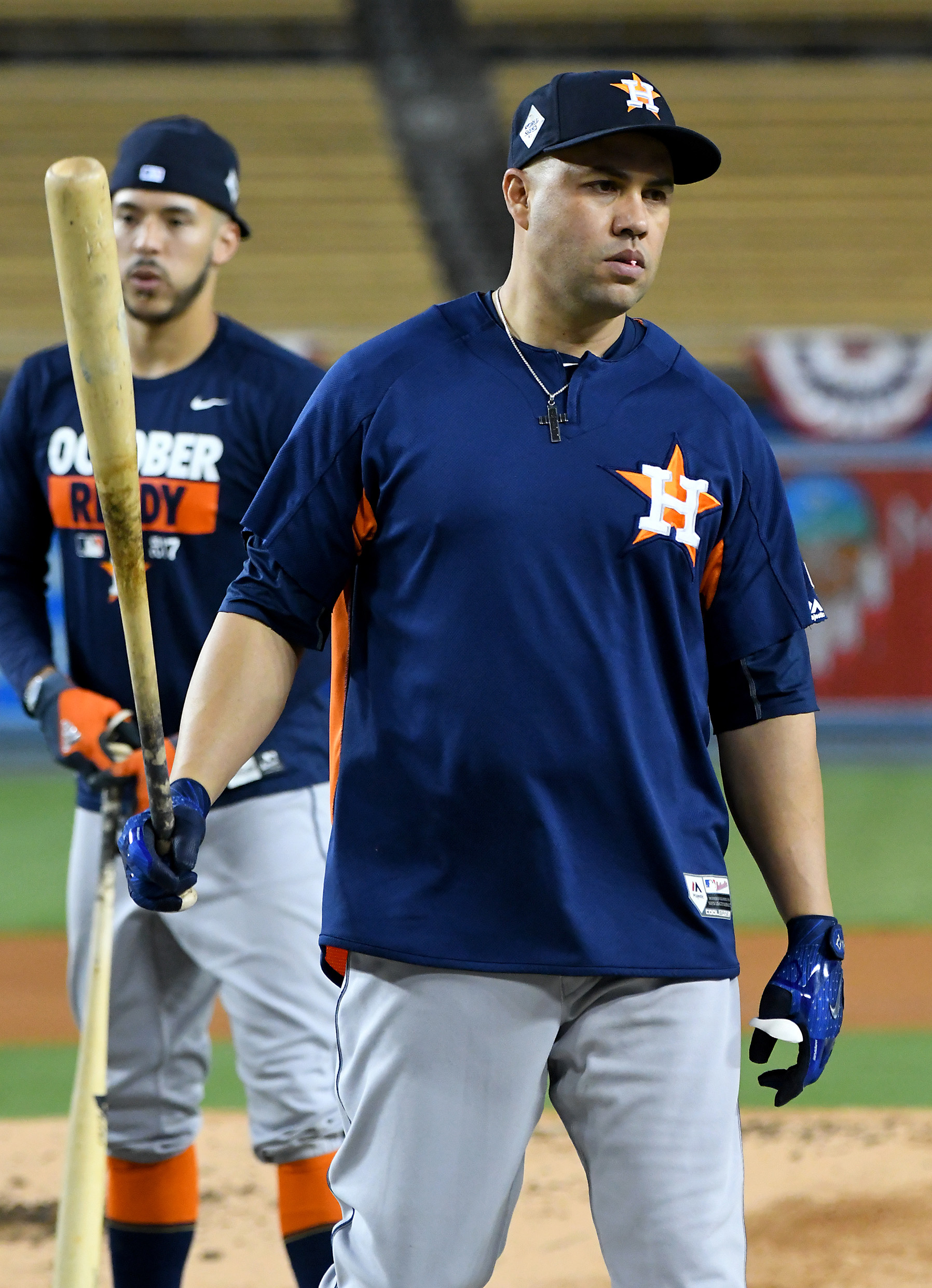 Oct 23, 2017; Los Angeles, CA, USA; Houston Astros designated hitter Carlos Beltran (15) takes batting practice one day prior to game one of the World Series against the Los Angeles Dodgers at Dodger Stadium. Mandatory Credit: Jayne Kamin-Oncea-USA TODAY Sports / Jayne Kamin-Oncea