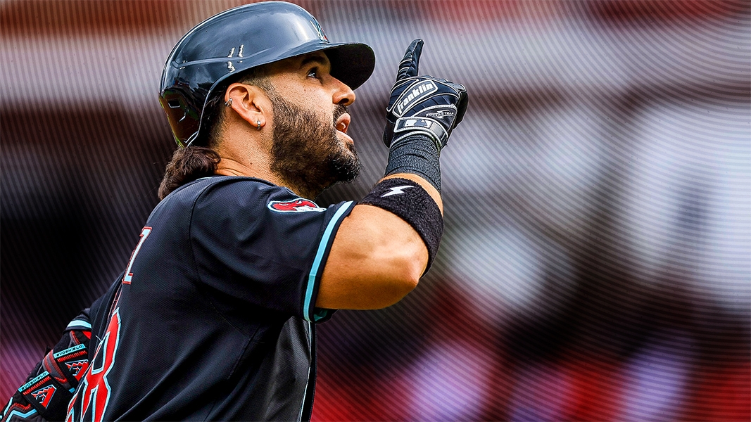May 9, 2025; Phoenix, Arizona, USA; Arizona Diamondbacks third baseman Eugenio Suarez celebrates after hitting a home run against the Los Angeles Dodgers at Chase Field. / Mark J. Rebilas - Imagn Images