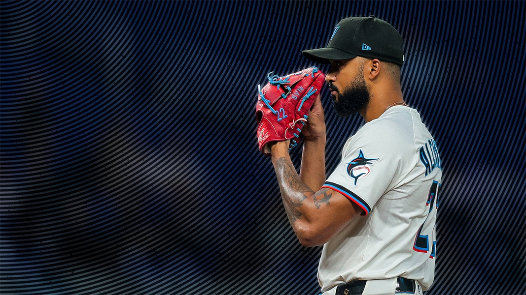 Mar 27, 2025; Miami, Florida, USA; Miami Marlins starting pitcher Sandy Alcantara (22) looks on against the Pittsburgh Pirates during the first inning at loanDepot Park. / Sam Navarro-Imagn Images