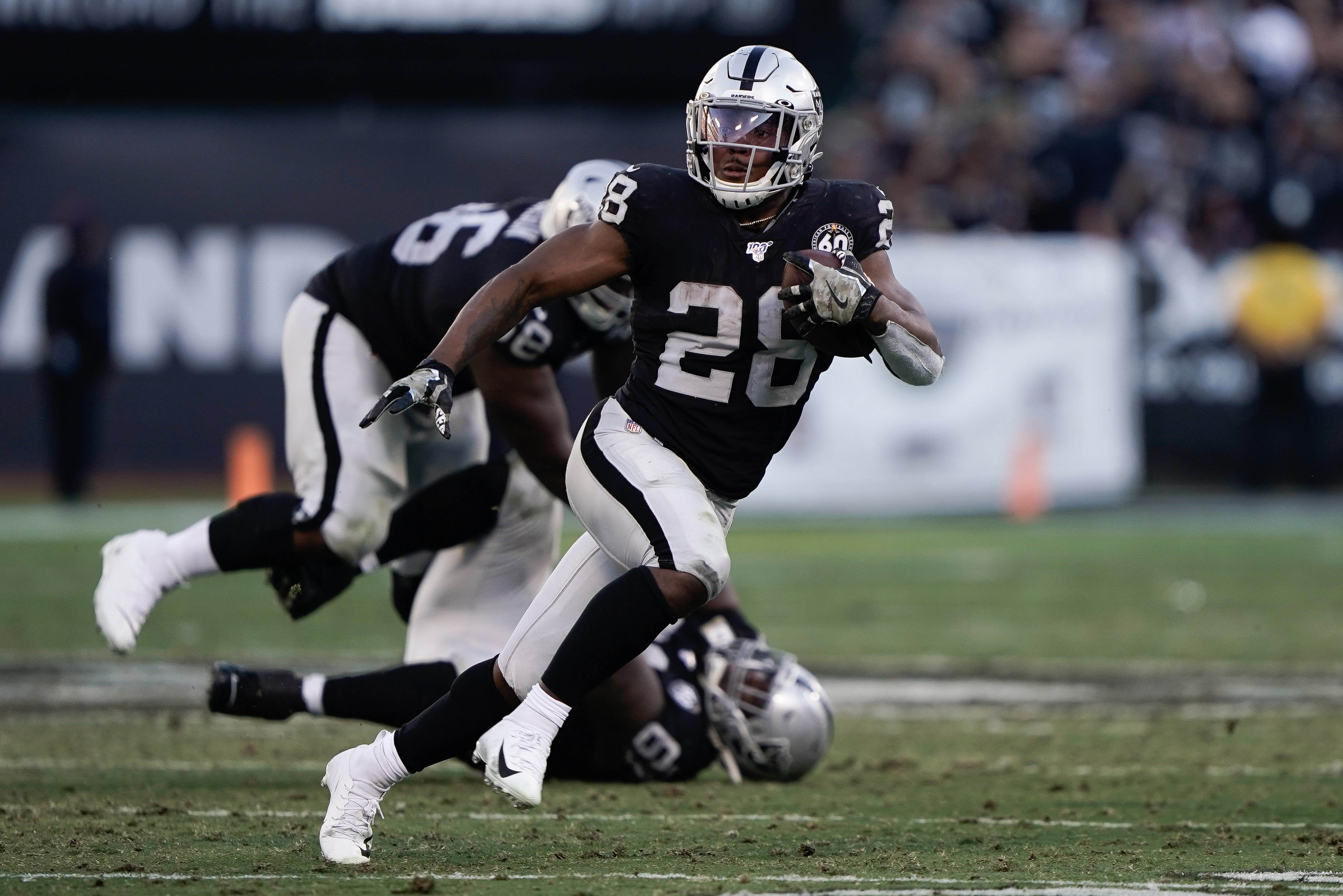 Nov 17, 2019; Oakland, CA, USA; Oakland Raiders running back Josh Jacobs (28) runs with the football in the game against the Cincinnati Bengals during the fourth quarter at the Oakland Coliseum. Mandatory Credit: Stan Szeto-USA TODAY Sports / Stan Szeto