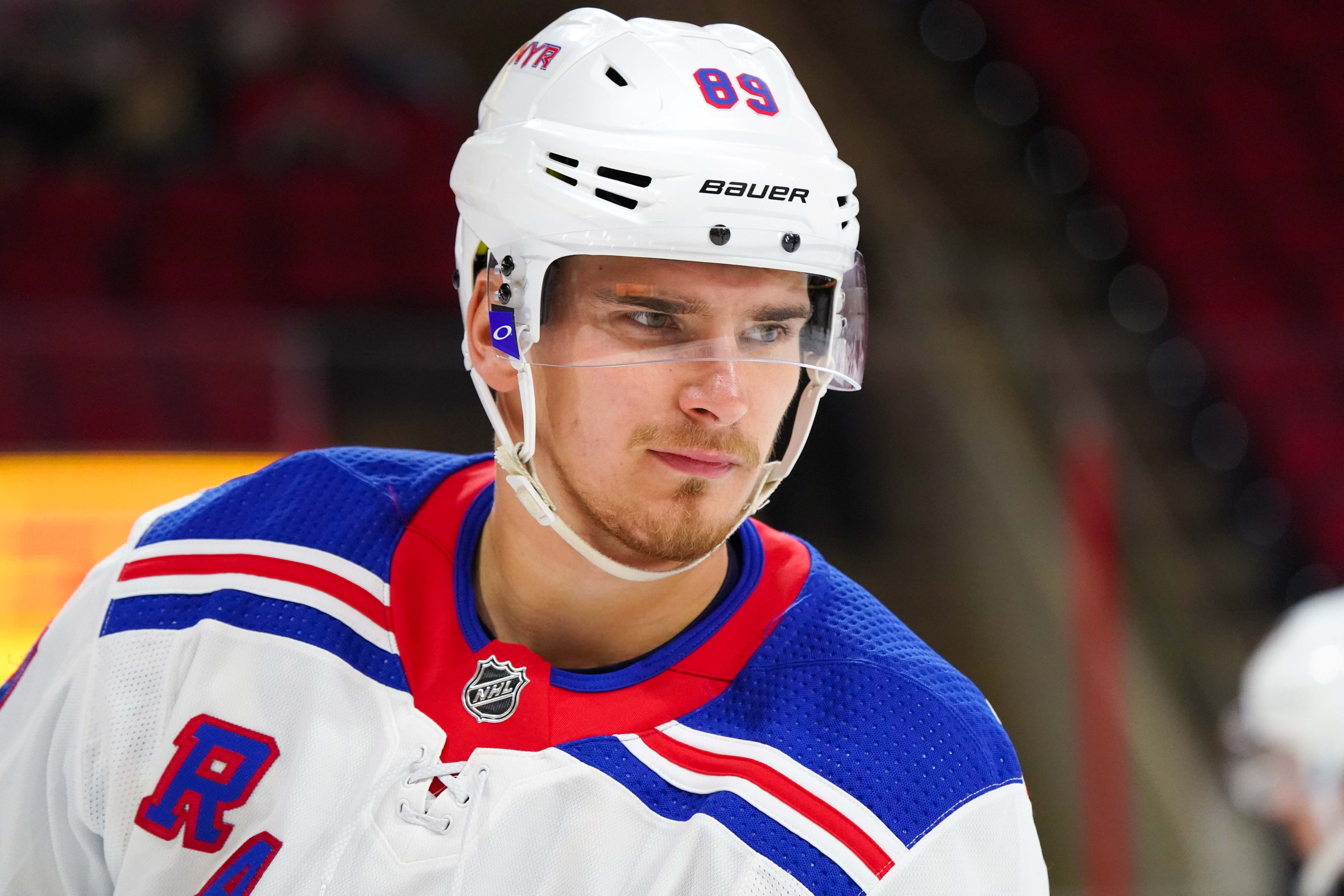 Oct 7, 2018; Raleigh, NC, USA; New York Rangers right wing Pavel Buchnevich (89) looks on before the game against the Carolina Hurricanes at PNC Arena. The Carolina Hurricanes defeated the New York Rangers 8-5. Mandatory Credit: James Guillory-USA TODAY Sports / James Guillory