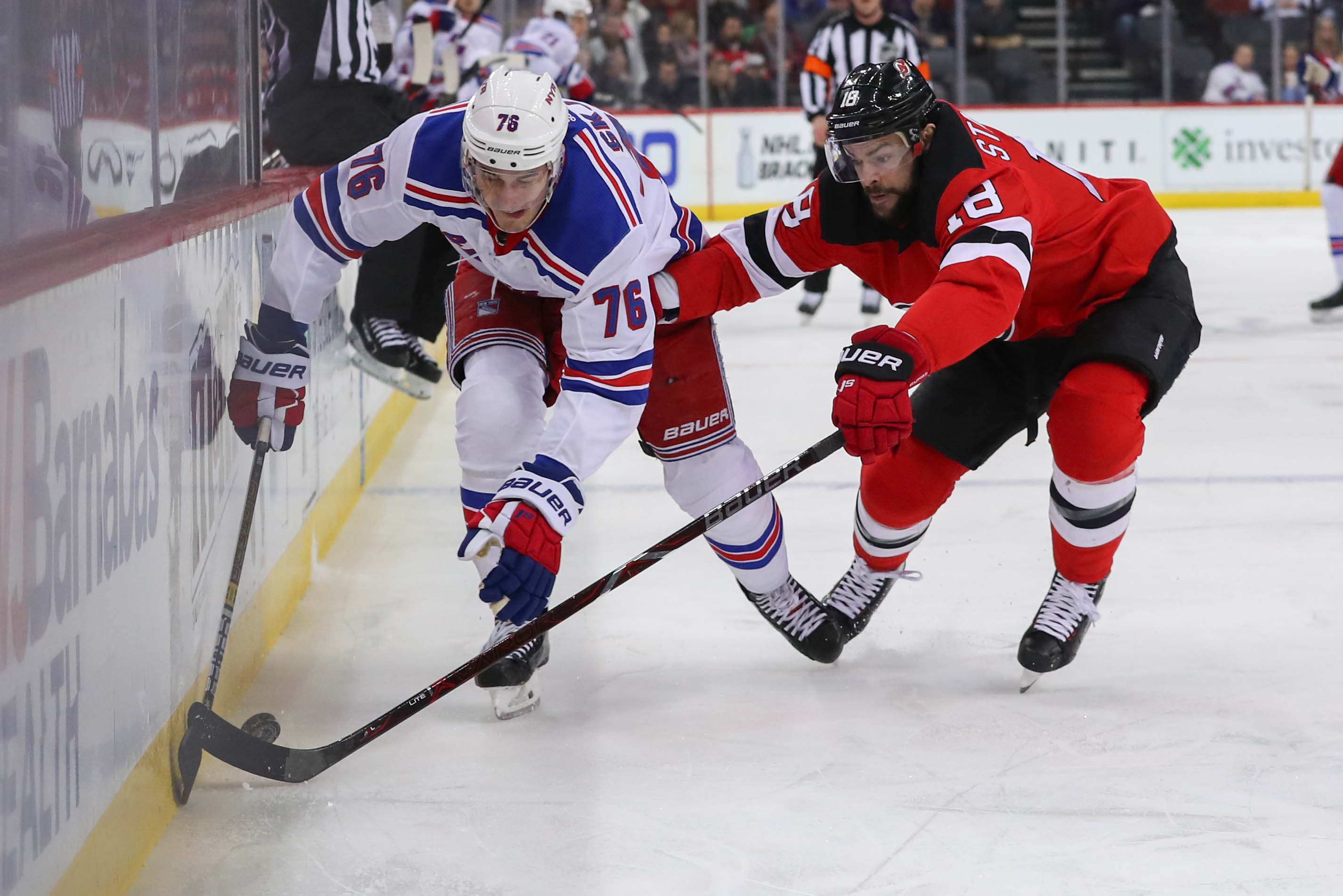 New York Rangers defenseman Brady Skjei and New Jersey Devils right wing Drew Stafford battle for the puck during the first period at Prudential Center. / Ed Mulholland/USA TODAY Sports