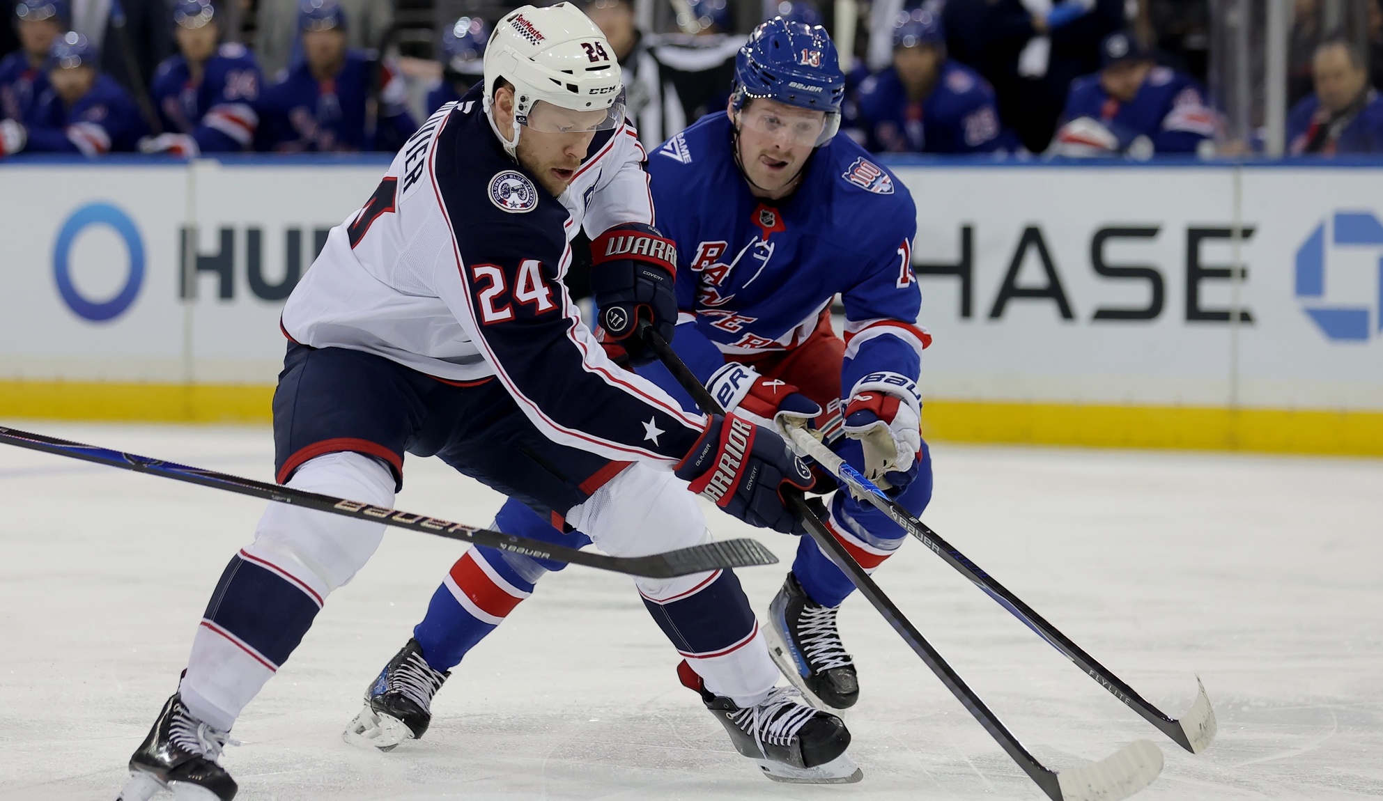 Rangers storm back with four third period goals, but fall to Blue Jackets in overtimeGabe Perreault had two goals and an assist3/3/2026, 3:22 AMAssociated PressColumbus Blue Jackets right wing Mathieu Olivier (24) plays the puck against New York Rangers left wing Alexis Lafreniere (13) during the first period at Madison Square Garden. / Brad Penner-Imagn Images