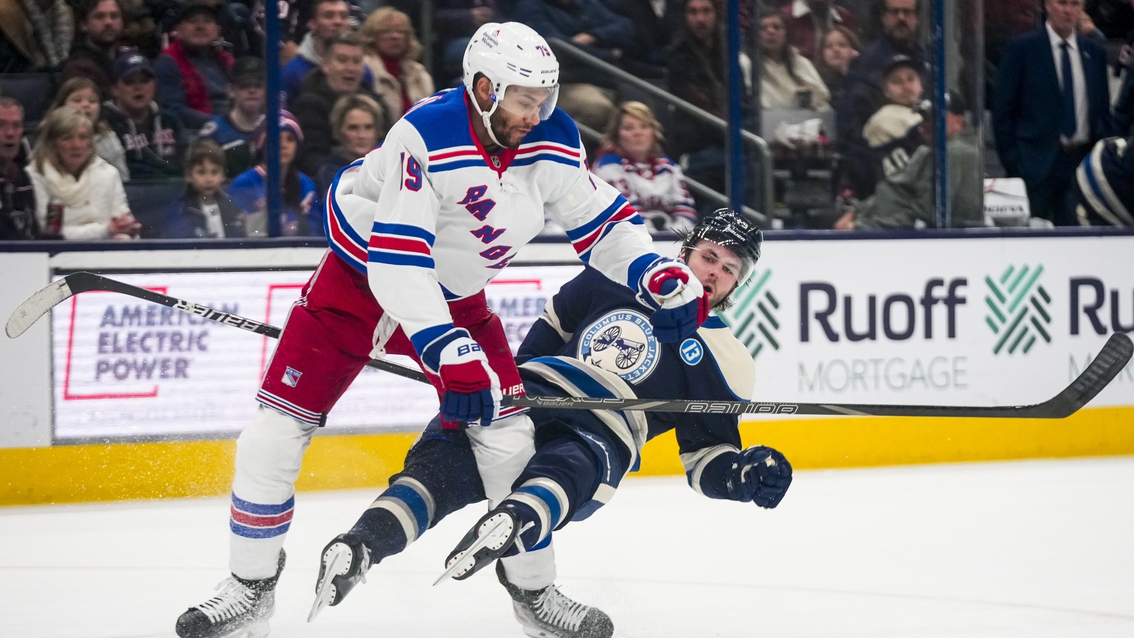 Feb 8, 2025; Columbus, Ohio, USA; New York Rangers defenseman K'Andre Miller (79) hits Columbus Blue Jackets center Adam Fantilli (19) in the second period at Nationwide Arena on Saturday, Feb. 8, 2025 in Columbus, Ohio. / Samantha Madar/USA TODAY Network via Imagn Images