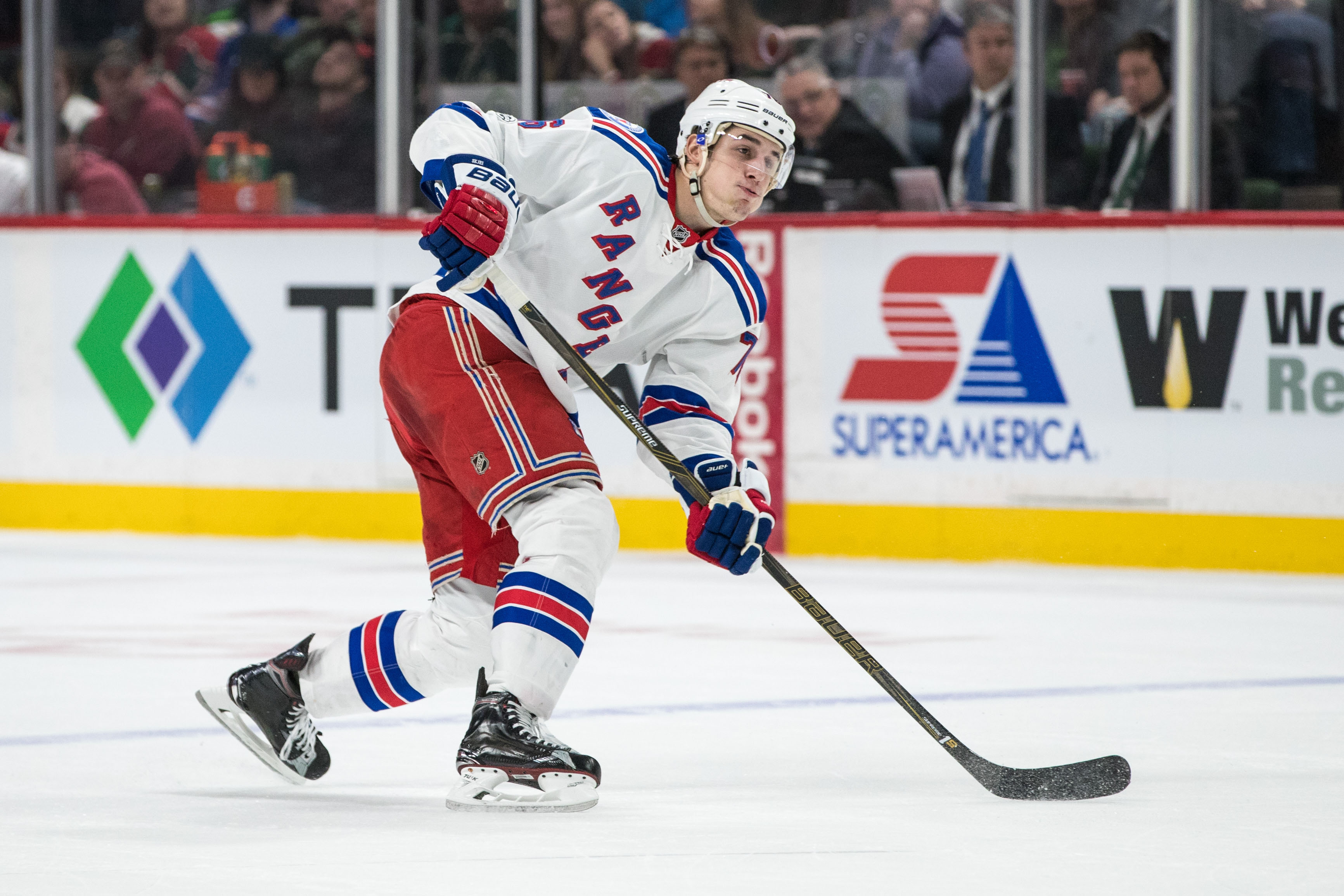 Mar 18, 2017; Saint Paul, MN, USA; New York Rangers defenseman Brady Skjei (76) shoots during the second period against the Minnesota Wild at Xcel Energy Center. Mandatory Credit: Brace Hemmelgarn-USA TODAY Sports / Brace Hemmelgarn