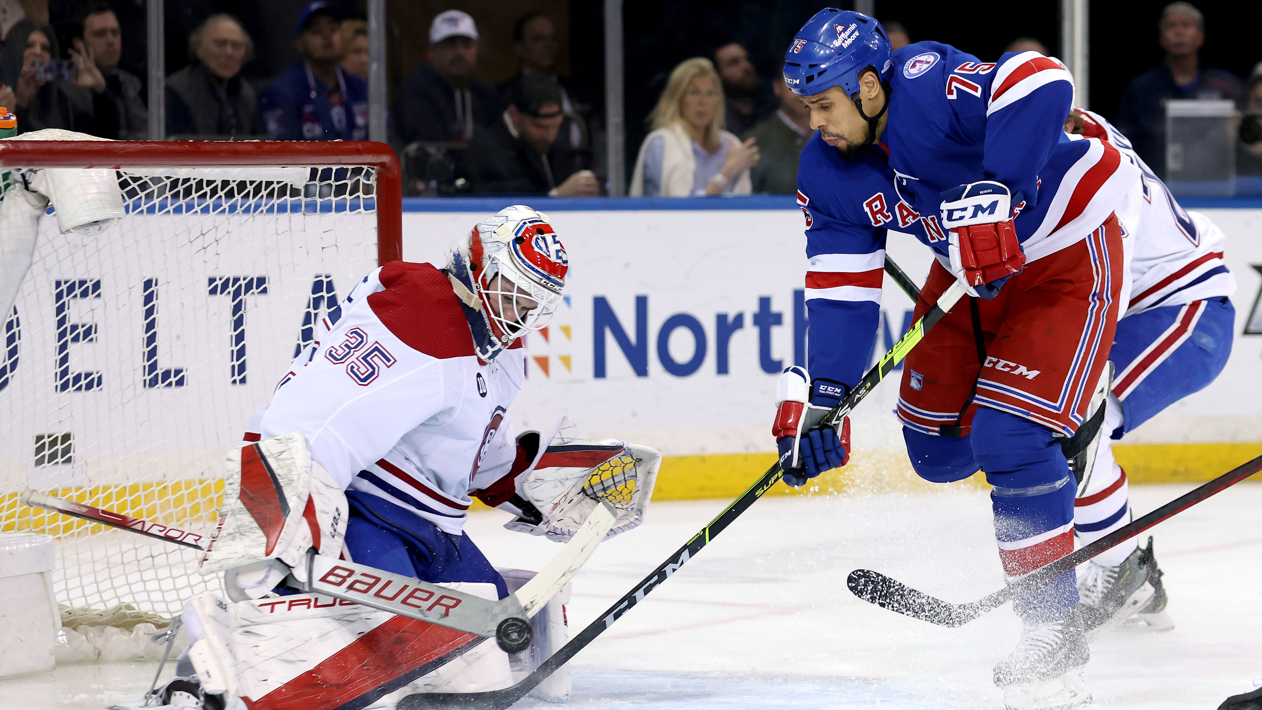 Apr 27, 2022; New York, New York, USA; Montreal Canadiens goaltender Sam Montembeault (35) makes a save against New York Rangers right wing Ryan Reaves (75) during the third period at Madison Square Garden. / Brad Penner-USA TODAY Sports