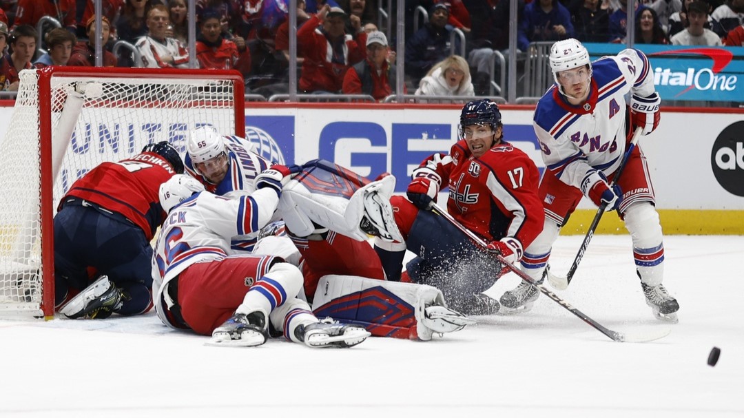 Rangers unable to hold down high-powered Capitals in 7-4 lossRangers sit 20 points behind first-place Capitals1/4/2025, 8:21 PMAssociated PressJan 4, 2025; Washington, District of Columbia, USA; Washington Capitals and New York Rangers players battle rot ehpuck in front of New York Rangers goaltender Jonathan Quick (32) in the first period at Capital One Arena. / Geoff Burke-Imagn Images