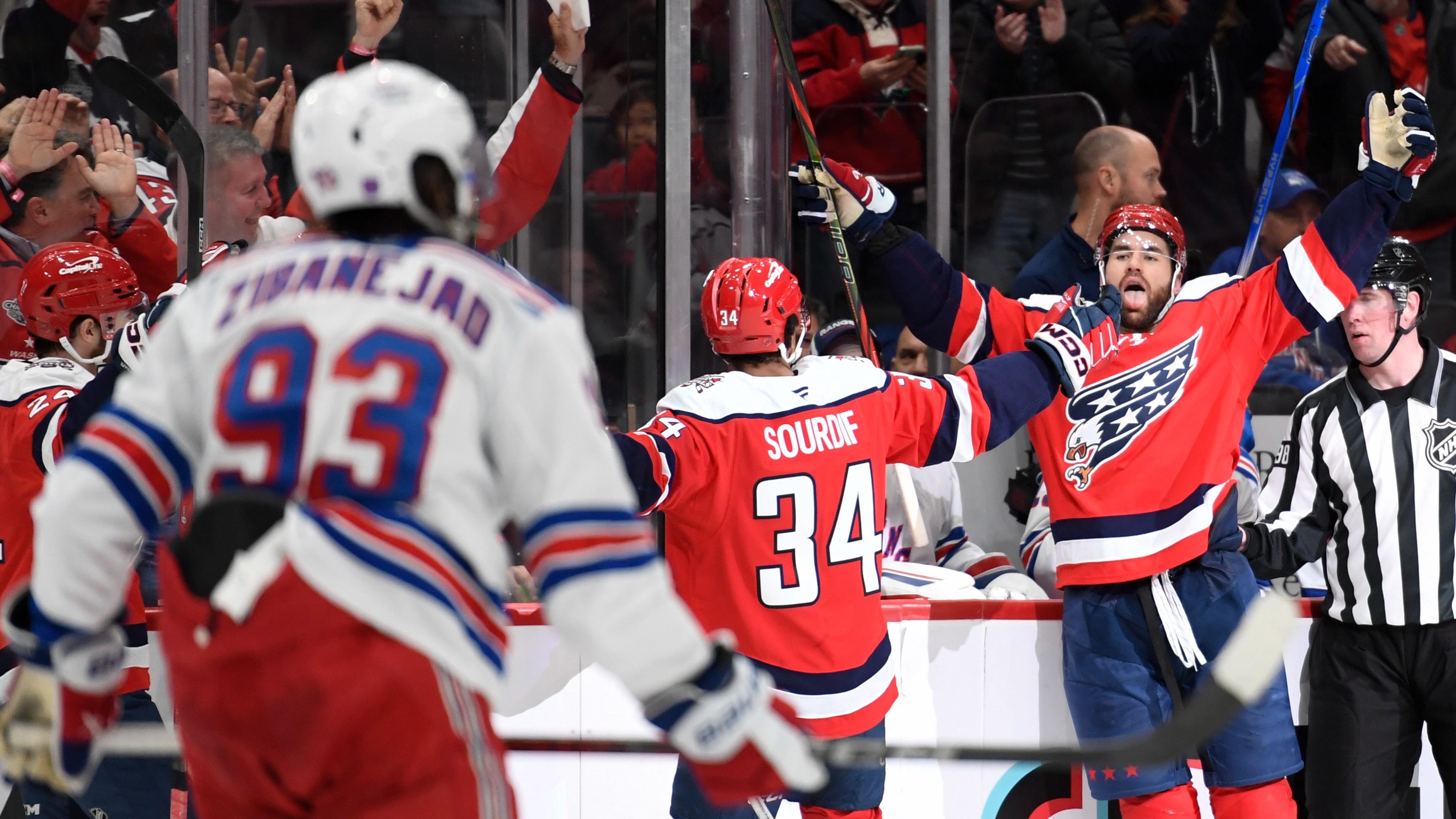 Dec 31, 2025; Washington, District of Columbia, USA; Washington Capitals right wing Tom Wilson (43) celebrates with right wing Justin Sourdif (34) after scoring a goal against the New York Rangers during the third period at Capital One Arena / Hannah Foslien-Imagn Images
