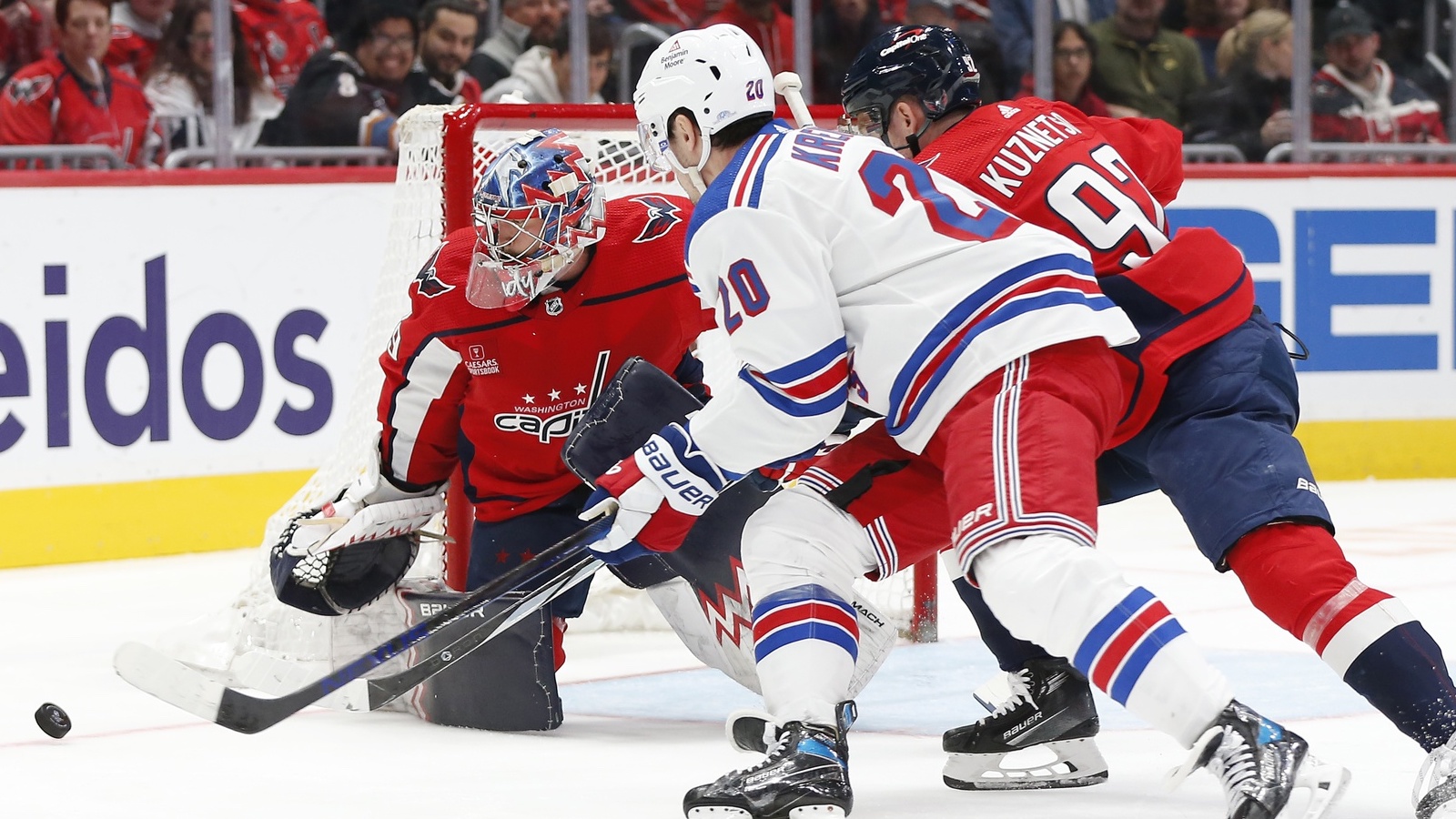 Rangers blanked by Capitals, 4-0, in second straight lossNew York has been outscored 10-2 in last two games12/10/2023, 3:10 AMAssociated PressWashington Capitals goaltender Charlie Lindgren (79) watches the puck in front of New York Rangers left wing Chris Kreider (20) and Capitals center Evgeny Kuznetsov (92) during the second period at Capital One Arena. / Amber Searls-USA TODAY Sports