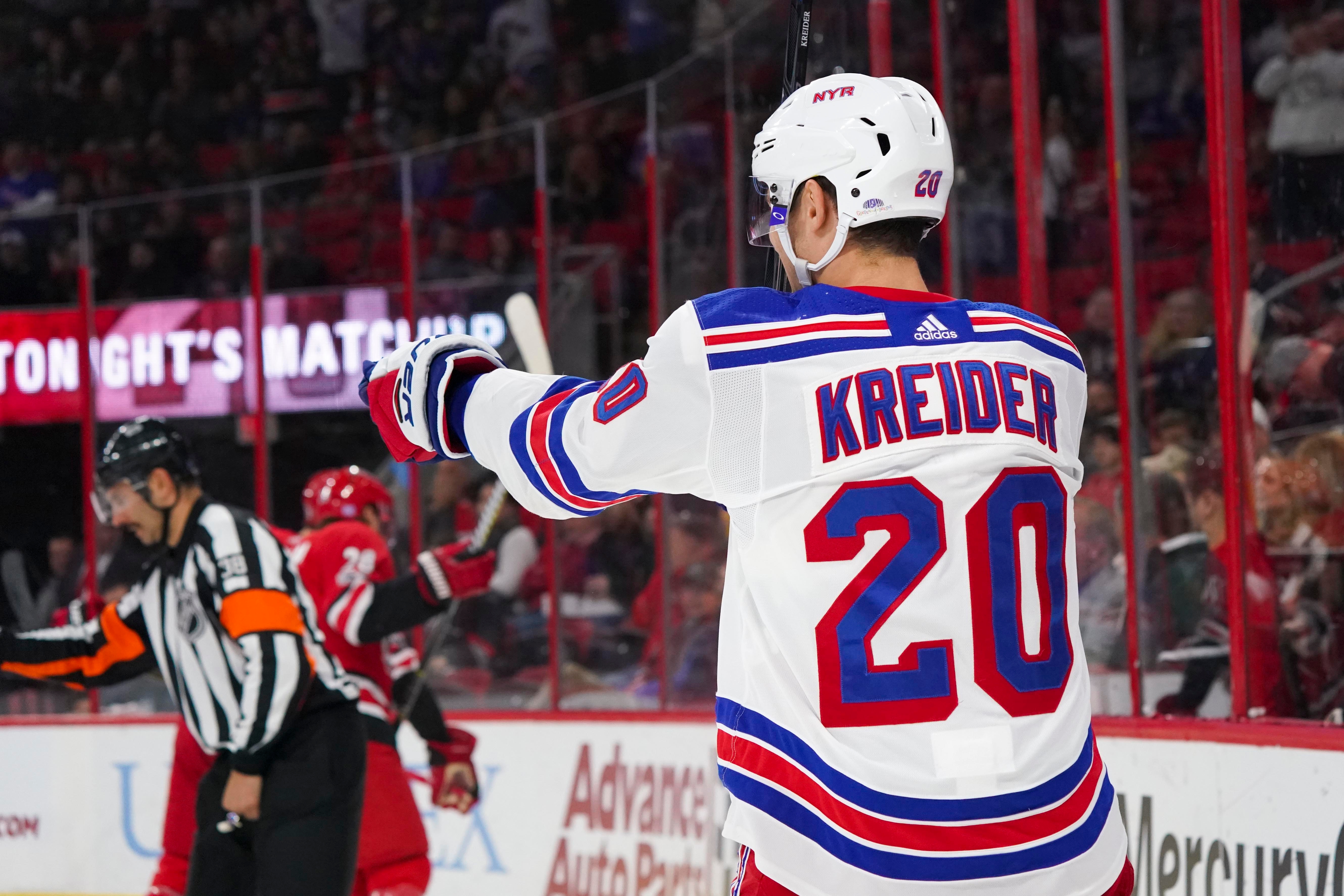 Nov 22, 2017; Raleigh, NC, USA; New York Rangers forward Chris Kreider (20) points after his third period goal against the Carolina Hurricanes at PNC Arena. The New York Rangers defeated the Carolina Hurricanes 6-1. Mandatory Credit: James Guillory-USA TODAY Sports / James Guillory