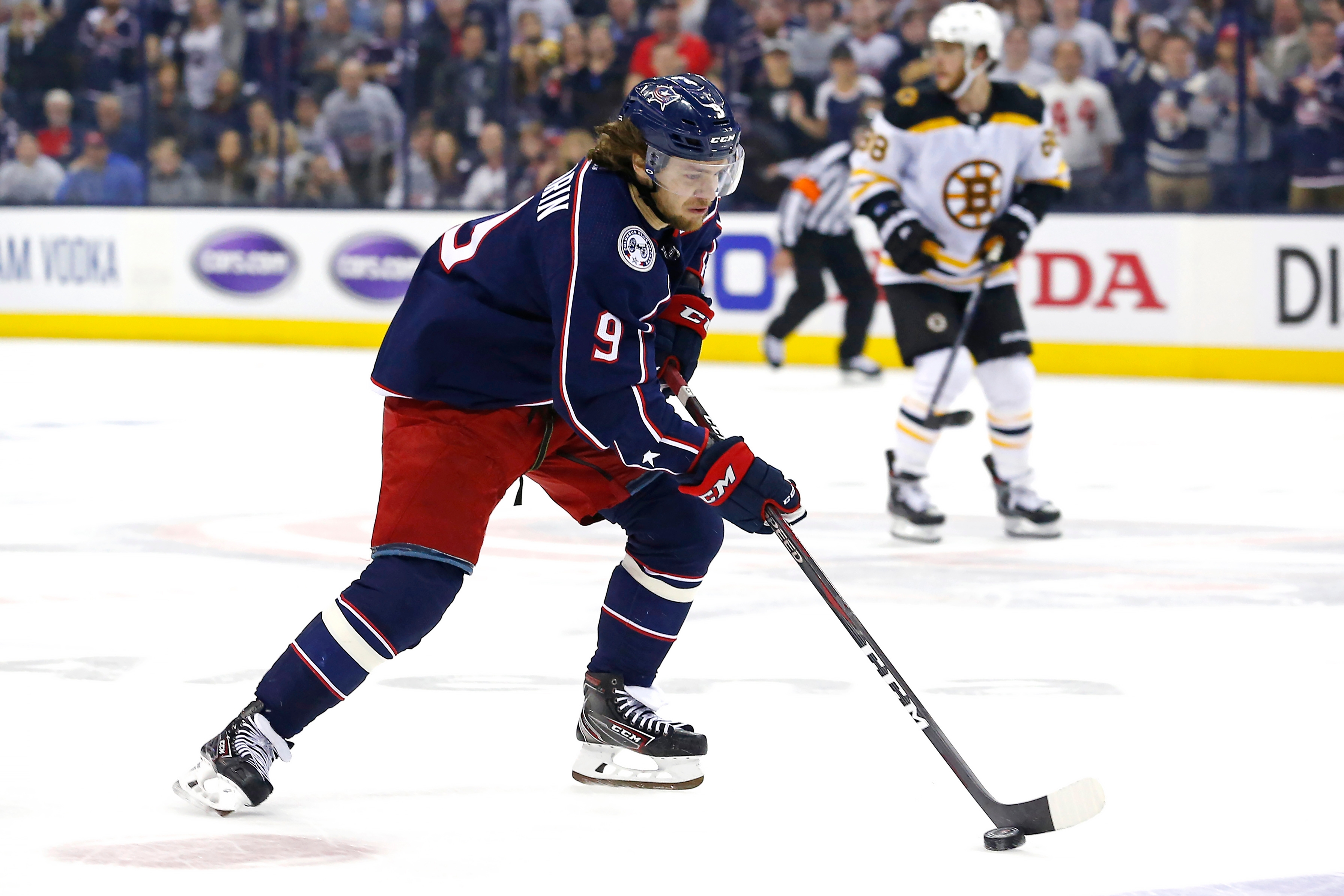 Apr 30, 2019; Columbus, OH, USA; Columbus Blue Jackets left wing Artemi Panarin (9) controls the puck against the Boston Bruins in the third period during game three of the second round of the 2019 Stanley Cup Playoffs at Nationwide Arena. Mandatory Credit: Russell LaBounty-USA TODAY Sports / Russell LaBounty