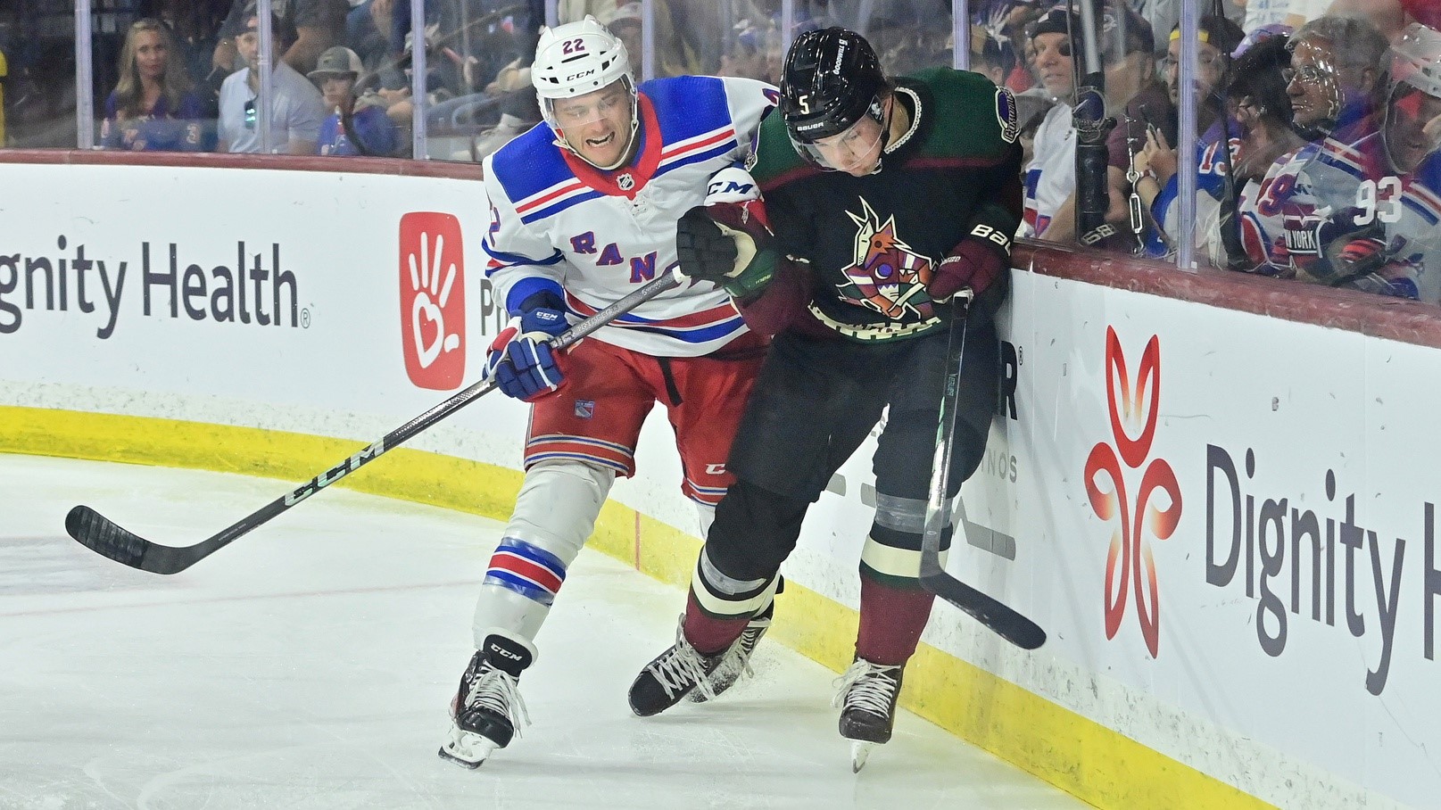 Rangers hold on to 8-5 win over pesky Coyotes in ArizonaAlexis Lafreniere had his first career hat trick in win3/31/2024, 1:09 AMAssociated PressMar 30, 2024; Tempe, Arizona, USA; Arizona Coyotes defenseman Michael Kesselring (5) and New York Rangers center Jonny Brodzinski (22) battle for the puck in the second period at Mullett Arena. / Matt Kartozian-USA TODAY Sports