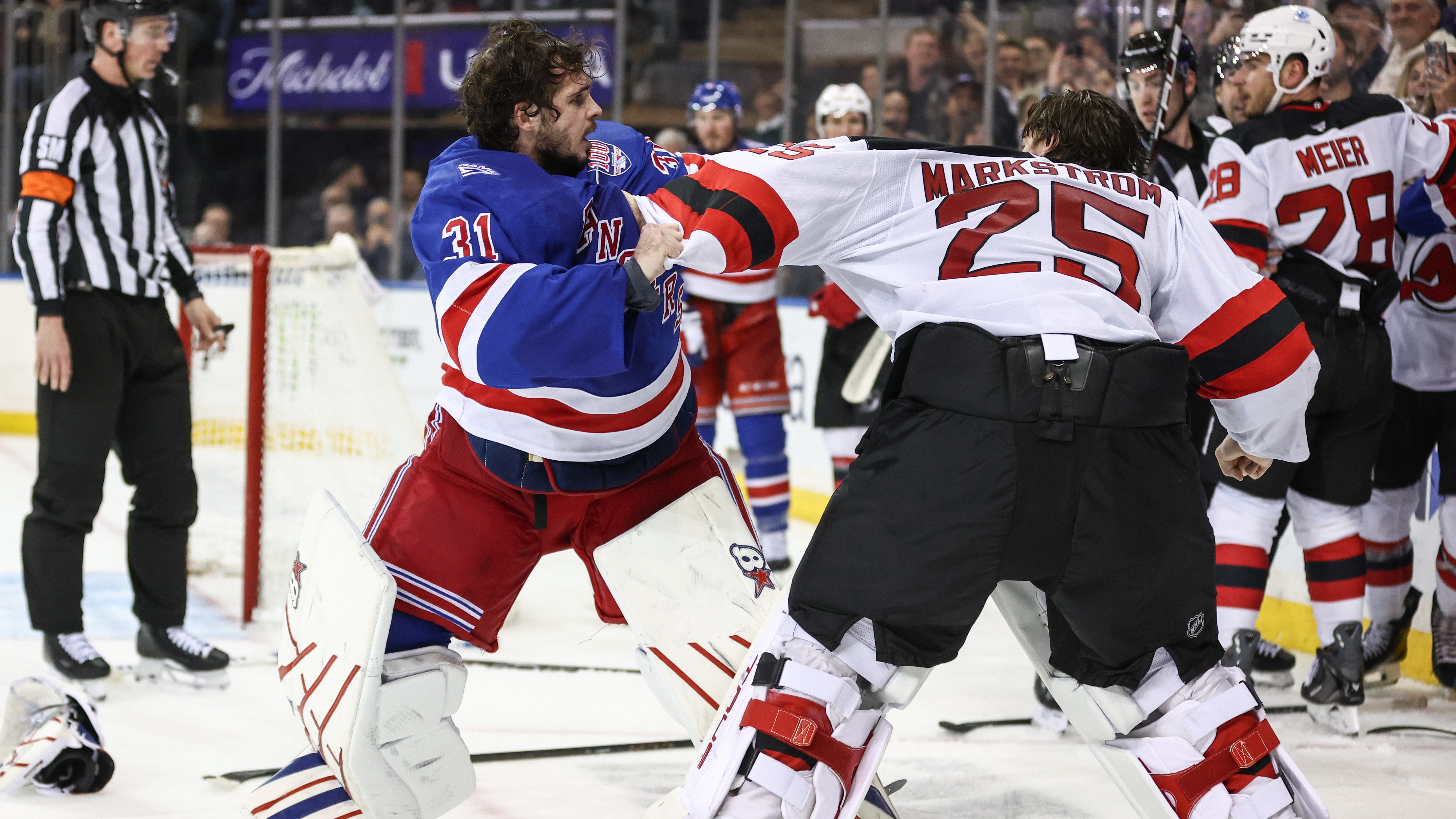 Igor Shesterkin stops 22, fights Jacob Markstrom as Rangers down Devils 4-1New York picks up first win over Devils this season4/1/2026, 2:08 AMAssociated PressMar 31, 2026; New York, New York, USA; New York Rangers goaltender Igor Shesterkin (31) and New Jersey Devils goaltender Jacob Markstrom (25) fight in the third period at Madison Square Garden. Mandatory Credit: Wendell Cruz-Imagn Images / © Wendell Cruz-Imagn Images