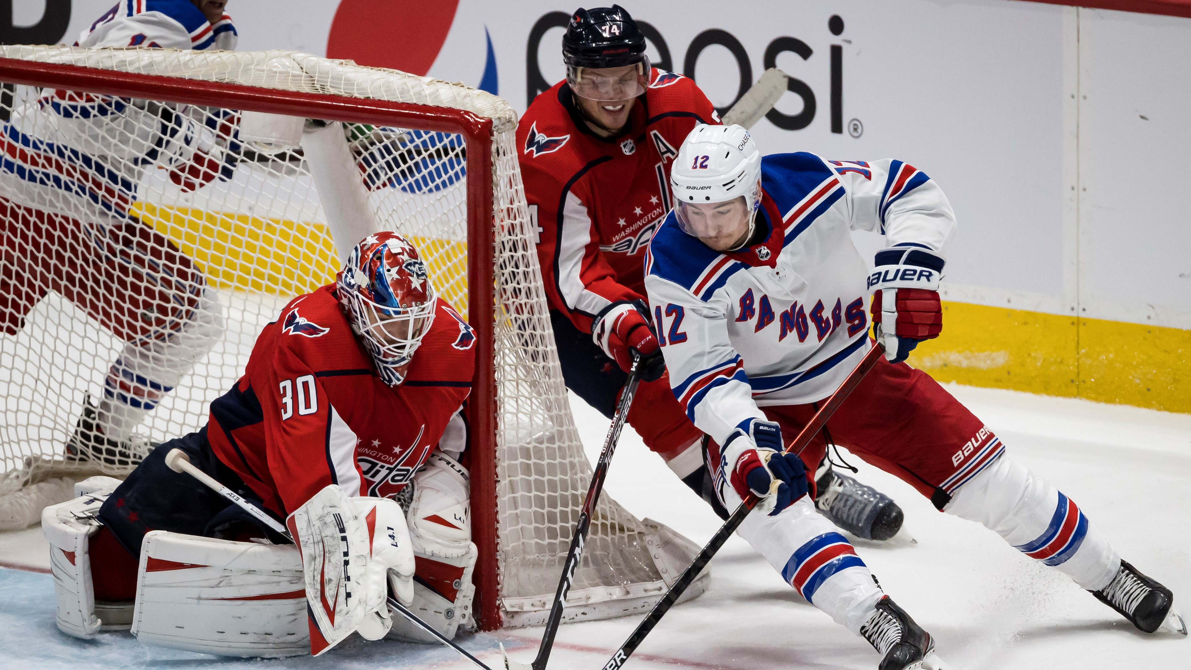 Mar 28, 2021; Washington, District of Columbia, USA; New York Rangers right wing Julien Gauthier (12) attempts a wrap around against Washington Capitals goaltender Ilya Samsonov (30) during the third period at Capital One Arena. / Scott Taetsch-USA TODAY Sports