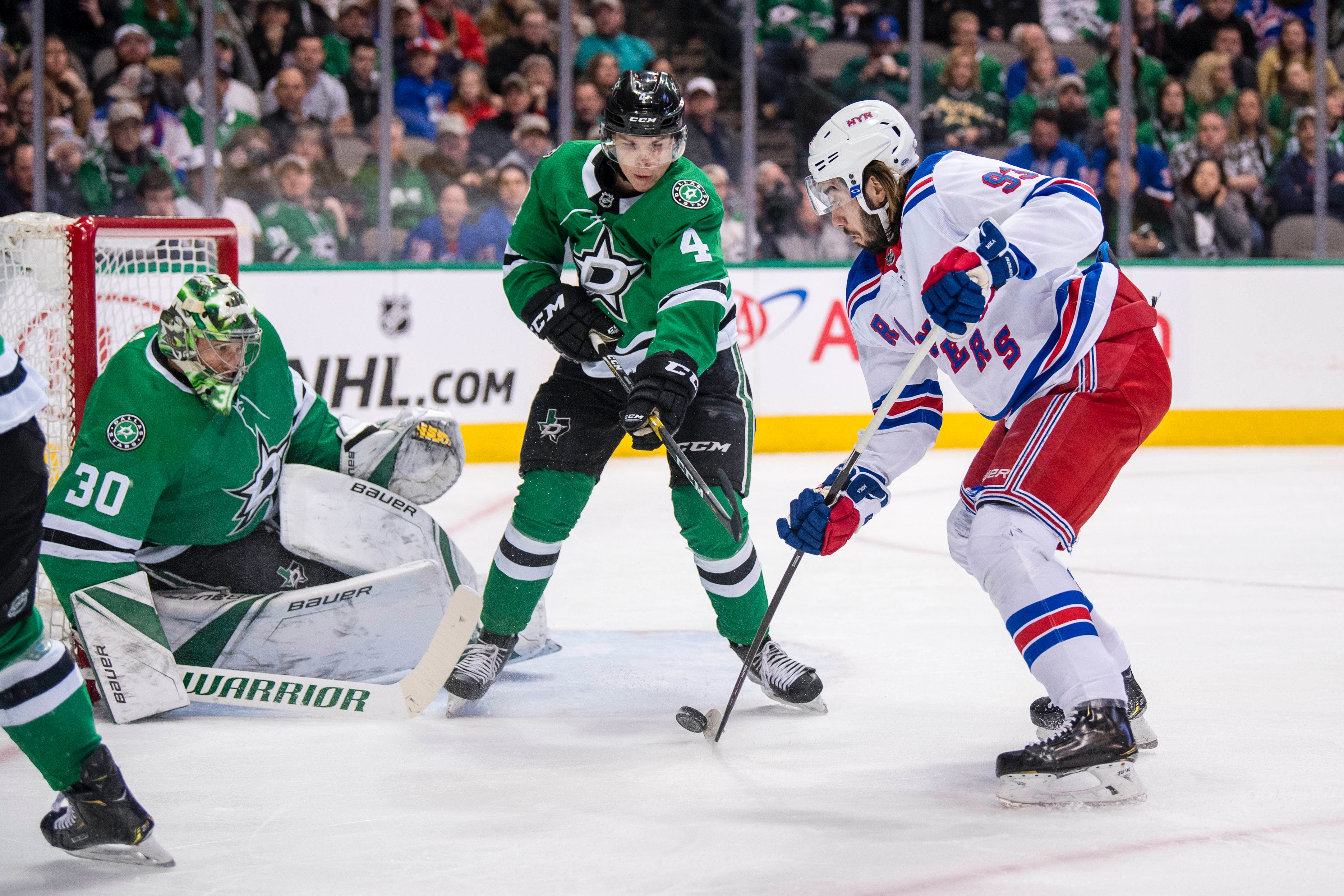 Mar 5, 2019; Dallas, TX, USA; Dallas Stars goaltender Ben Bishop (30) and defenseman Miro Heiskanen (4) go up against New York Rangers center Mika Zibanejad (93) during the first period at American Airlines Center. Mandatory Credit: Jerome Miron-USA TODAY Sports / Jerome Miron