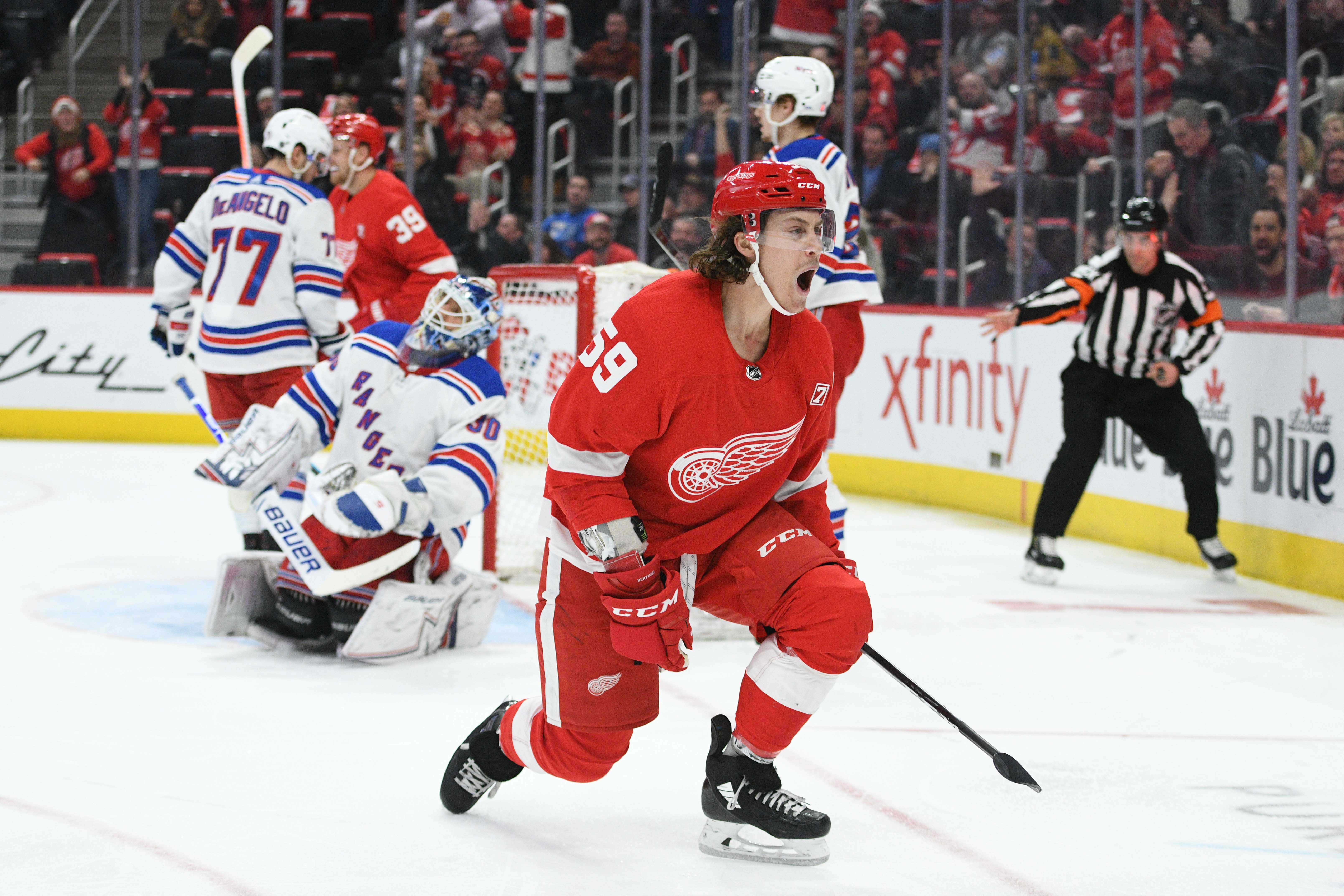 Mar 7, 2019; Detroit, MI, USA; Detroit Red Wings left wing Tyler Bertuzzi (59) celebrates his goal during the second period against the New York Rangers at Little Caesars Arena. Mandatory Credit: Tim Fuller-USA TODAY Sports / Tim Fuller