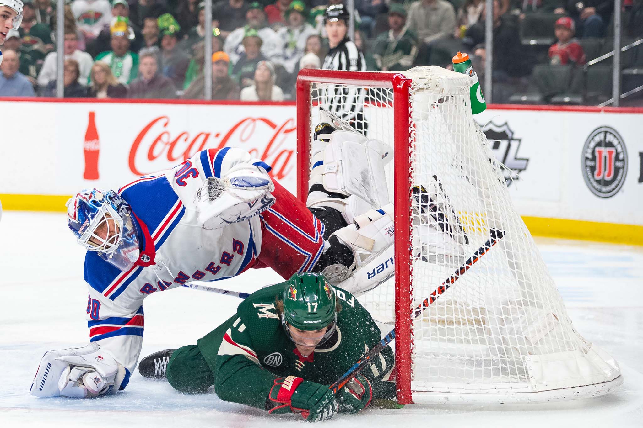 Mar 16, 2019; Saint Paul, MN, USA; Minnesota Wild left wing Marcus Foligno (17) slides into New York Rangers goaltender Henrik Lundqvist (30) during the first period at Xcel Energy Center. Mandatory Credit: Harrison Barden-USA TODAY Sports / Harrison Barden