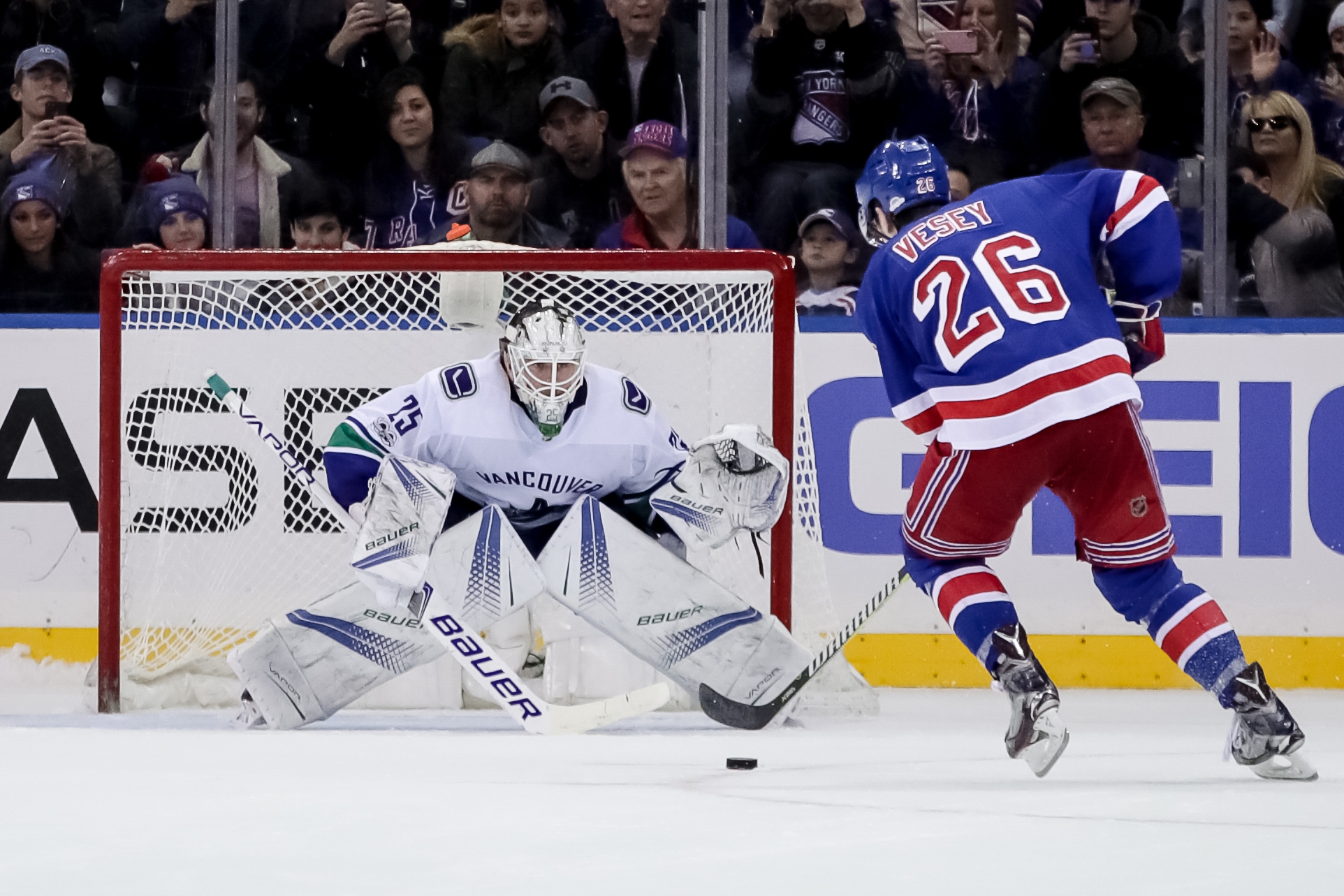 Nov 26, 2017; New York, NY, USA; New York Rangers left wing Jimmy Vesey (26) shoots the puck on Vancouver Canucks goalie Jacob Markstrom (25) during a shoot out at Madison Square Garden. Mandatory Credit: Vincent Carchietta-USA TODAY Sports / Vincent Carchietta