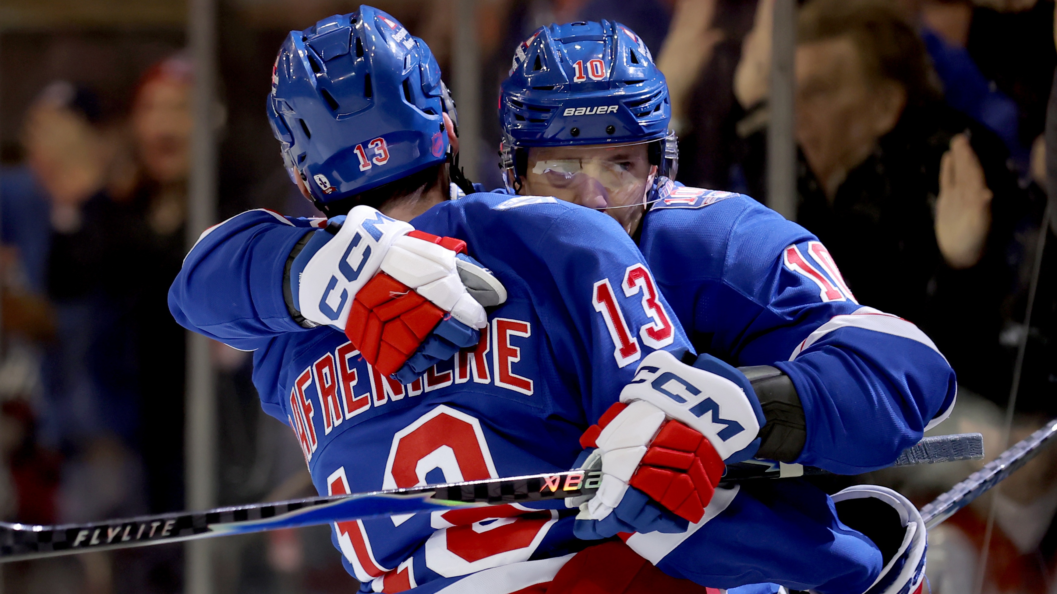 Rangers complete late comeback, pull out 5-4 win over Flyers in shootoutPanarin scored twice in regulation and once in the shootout12/20/2025, 8:33 PMJohn FlaniganFreelance Editorial ProducerNew York Rangers left wing Artemi Panarin (10) celebrates his goal against the Philadelphia Flyers with left wing Alexis Lafreniere (13) during the second period at Madison Square Garden / Brad Penner - Imagn Images